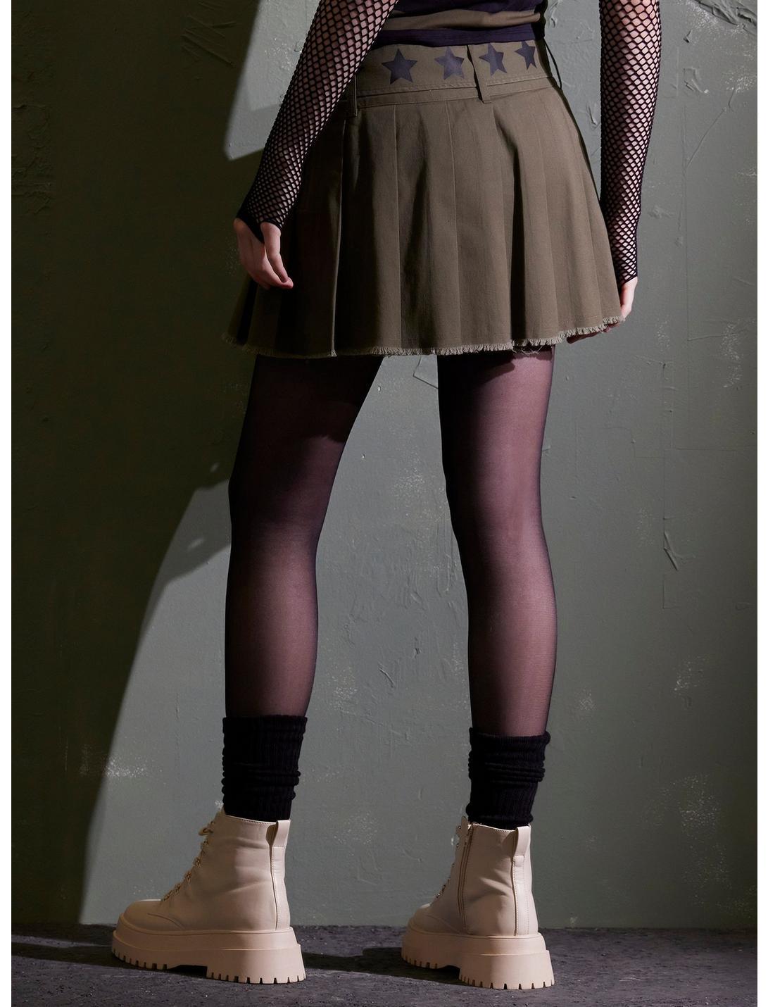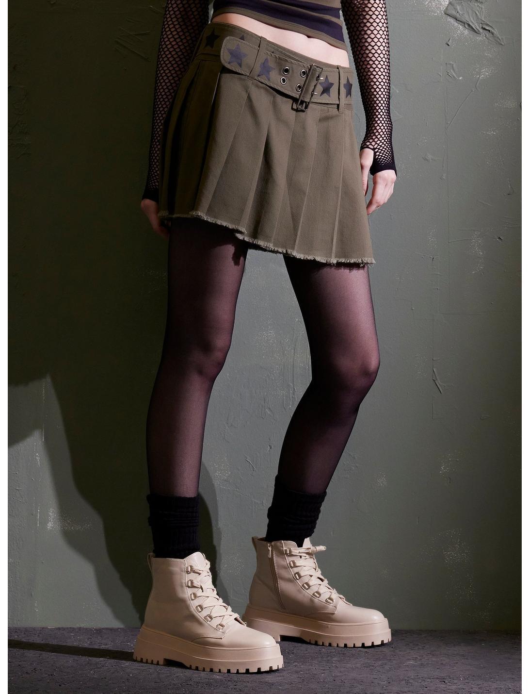 Get the muddy, grungy look with this green pleated skirt! It has a low rise and comes with a removable belt with star and grommet detailing, plus a raw hem. Complete with a side zipper closure.Please note: Style is fitted with no stretch; size up for a looser fit.100% cottonWash cold; dry lowLength: 14''ImportedListed in junior sizes
