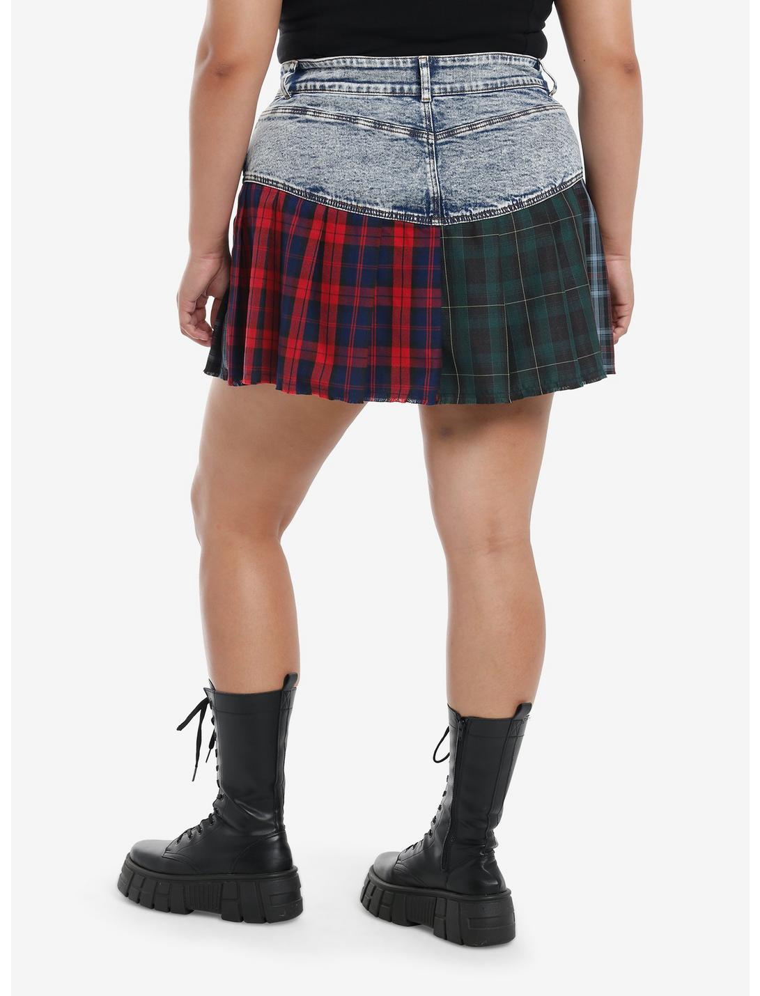 Mix up your plaid and denim vibes with this edgy skirt! Featuring a light wash denim waistband with pleated mixed plaid panels. Perfect for adding some punk attitude to your look! Comes with front pockets.Please note: Style is fitted with no stretch; size up for a looser fit.99% cotton; 1% spandexWash cold; dry flatNon-stretchLength: 20''ImportedModel is 5'10''Model wears size 1
