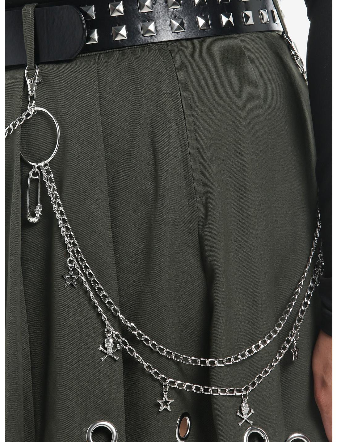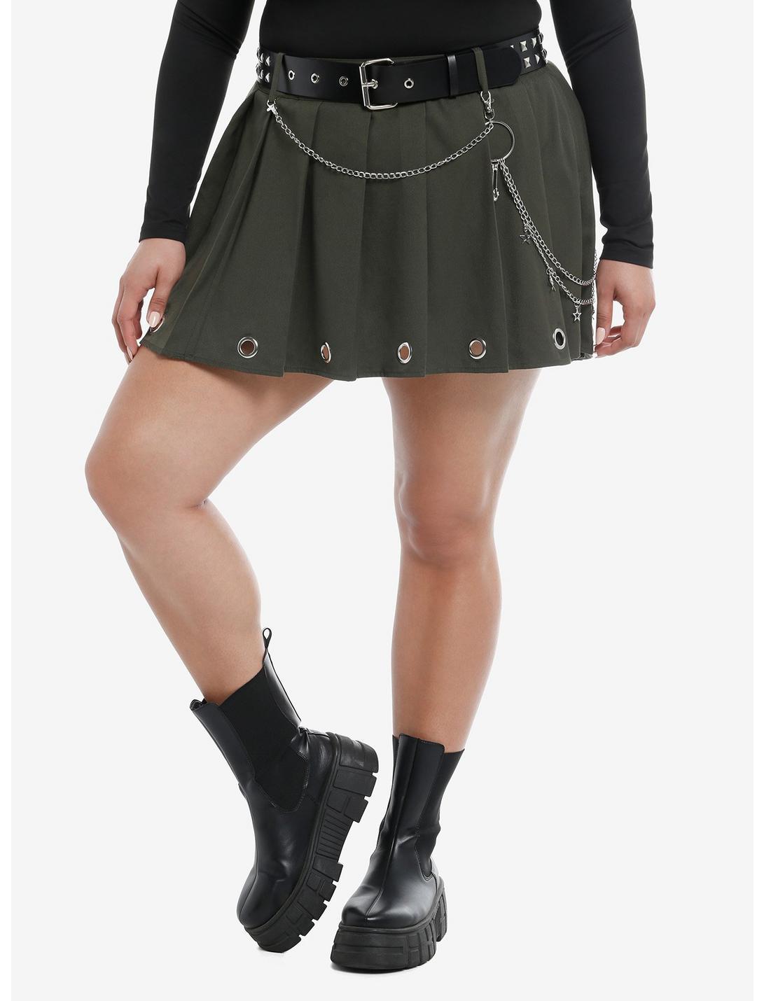 Go for the grunge look, but make it cute! This olive, pleated skirt features silver-tone grommet detailing on the hem. Comes with a black belt with pyramid studs, plus removable side chains with skull and star charms. Zipper closure.Please note: Style is fitted with no stretch; size up for a looser fit.100% cottonWash cold; dry flatNon-stretch materialLength: 18''ImportedModel is 5'10''Model wears size 1