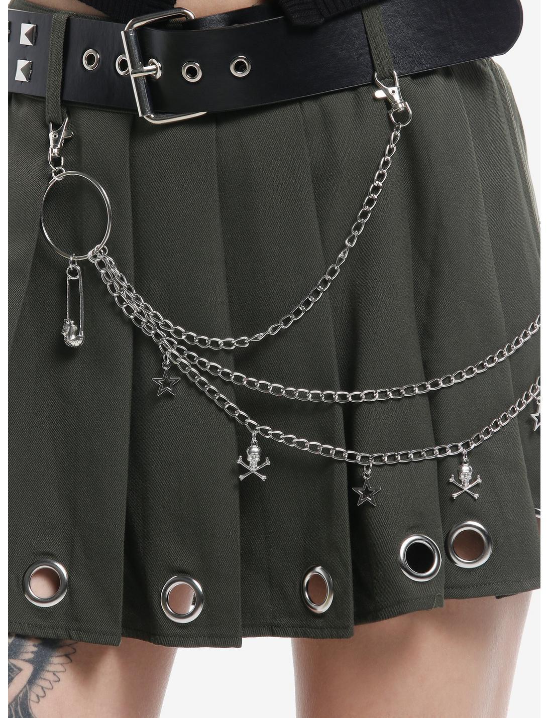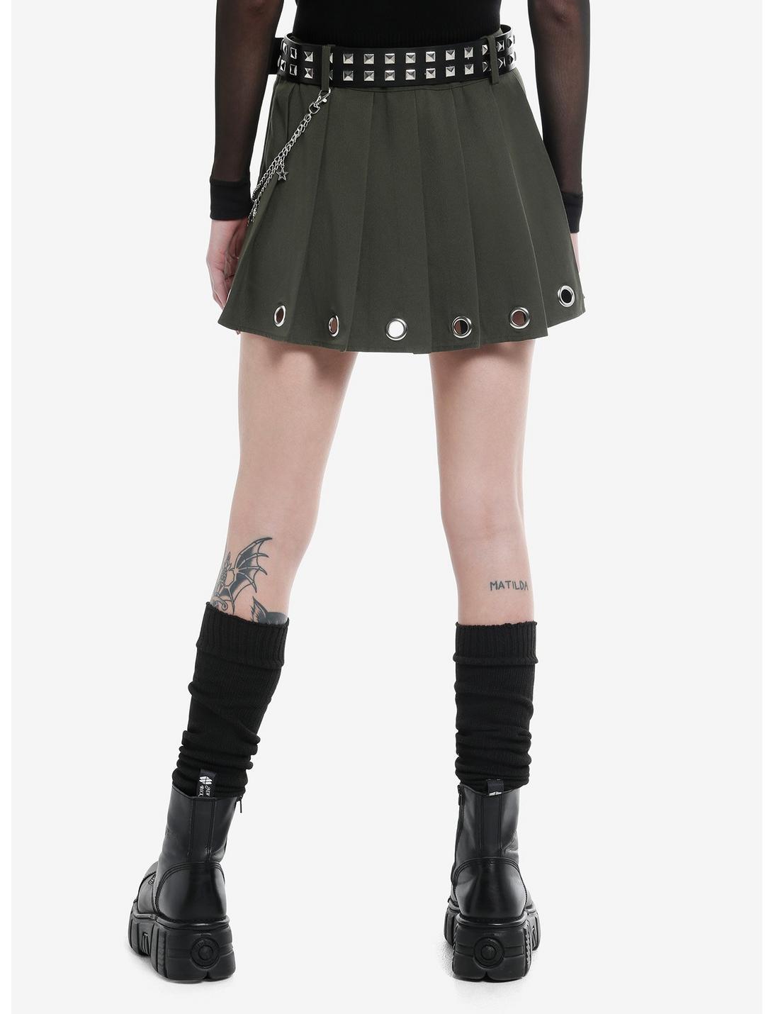 Go for the grunge look, but make it cute! This olive, pleated skirt features silver-tone grommet detailing on the hem. Comes with a black belt with pyramid studs, plus removable side chains with skull and star charms. Zipper closure.Please note: Style is fitted with no stretch; size up for a looser fit.100% cottonWash cold; dry flatNon-stretch materialLength: 15''ImportedListed in junior sizesModel is 5'10''Model wears size Small