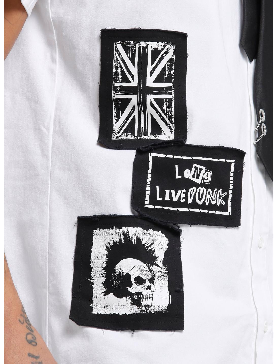Long live punk! This white woven button-up has black frayed patches printed with a Union Jack, a skull with a mohawk and "Long Live Punk" text. The collar is pierced, and the chest pocket has safety pins and a metal skull emblem on it. The black clip-in tie is pierced and removable.60% cotton; 40% punkWash cold; dry lowRemovable tieImportedListed in men's/unisex sizesModel is 6'1"Model wears size Medium