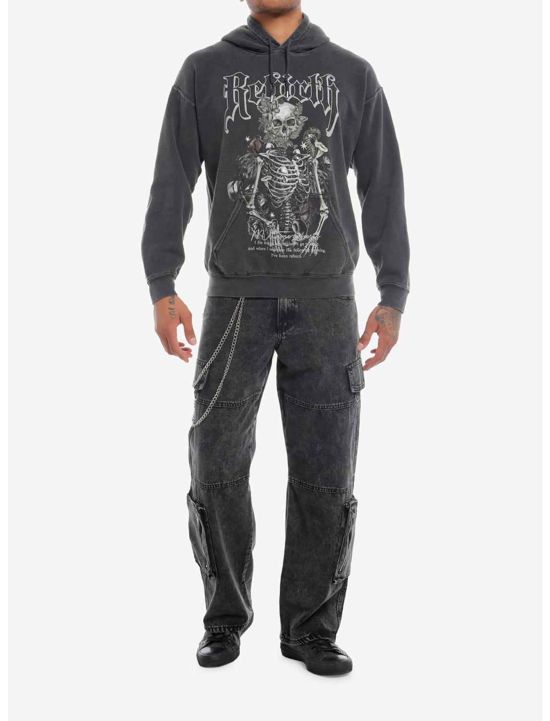 Dig up something cozy to wear! This grey hoodie features a skeleton covered with moths and greenery printed on the chest and over the kangaroo pocket, plus "Rebirth" above. Comes with a drawstring hood.50% cotton; 50% polyesterWash cold; dry lowLength: 25''ImportedListed in men's/unisex sizesModel is 6'1''Model wears size Medium