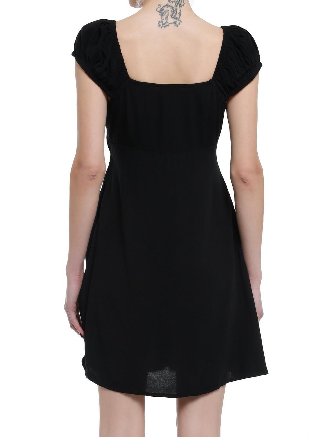 Add something rosy to your LBD collection! This babydoll dress features elasticated cap sleeves with a dainty red rosette at the square neckline. Comes with pockets and ruching at the empire bust.100% rayonWash cold; dry lowLength: 34"Stretchy materialImportedListed in junior sizesModel is 5'10"Model wears size Small