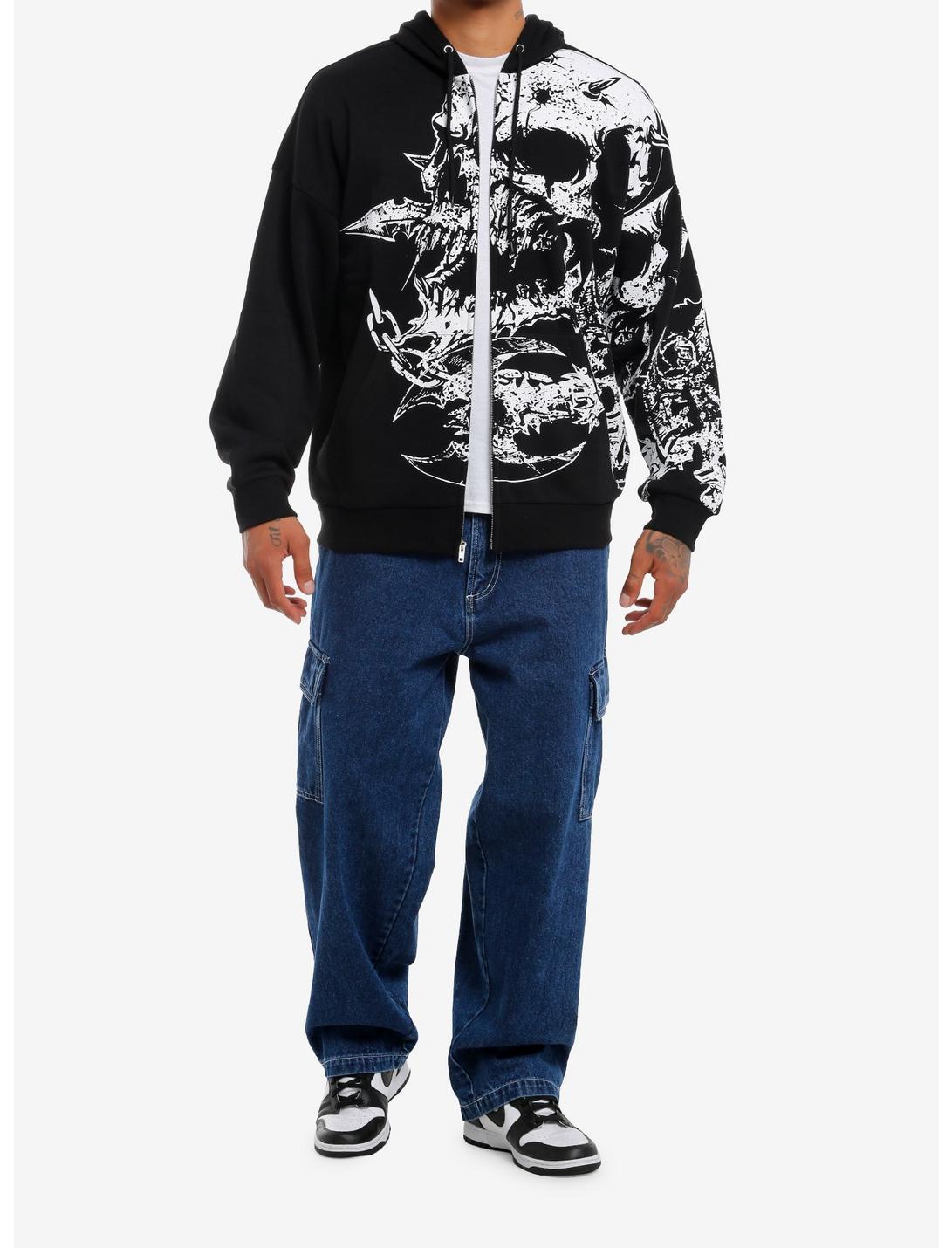 Look bad to the bone in this zip-up hoodie! Featuring a large wrap around design of a distressed skull covered with horns, plus weapons. Comes with a drawstring hood and front pockets.52% cotton; 48% polyesterWash cold; dry lowLength: 29''ImportedListed in men's/unisex sizesModel is 6'1''Model wears size Medium