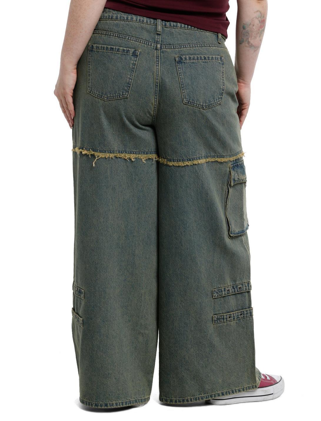These vintage wash wide leg jeans have frayed detail on the seams, grommet taping, straps with D-rings and a cargo pocket on the right thigh. No stretch.100% cottonWash cold; dry flatRise: 15"Inseam: 31"ImportedModel is 5'8 1/2"Model wears size 16