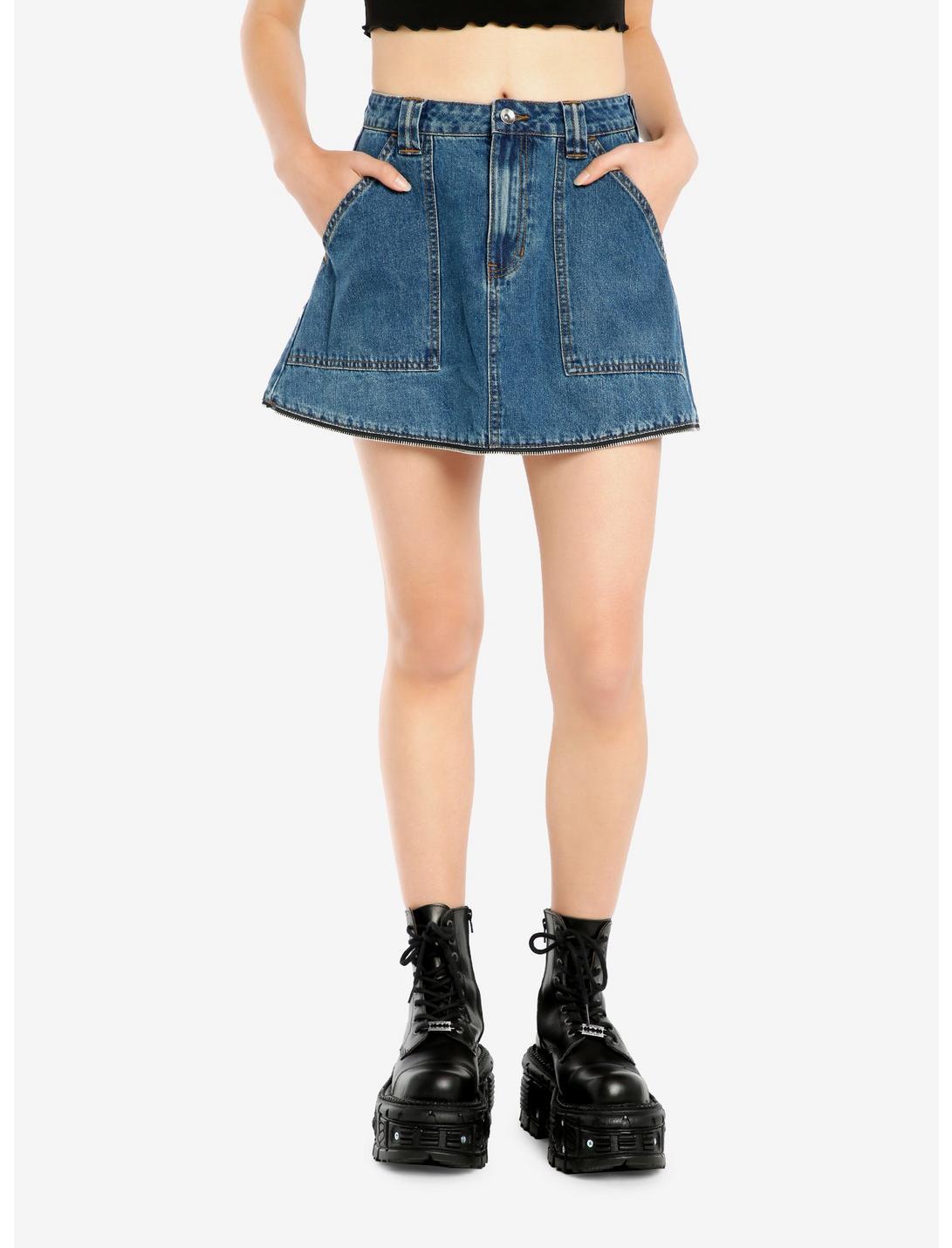 This indigo denim maxi skirt has two portions that zip off, as well as grommeted cargo pockets on each side. 99% cotton; 1% spandexWash cold; dry lowLength: 36"ImportedListed in junior sizesModel is 5'10"Model wears size Small