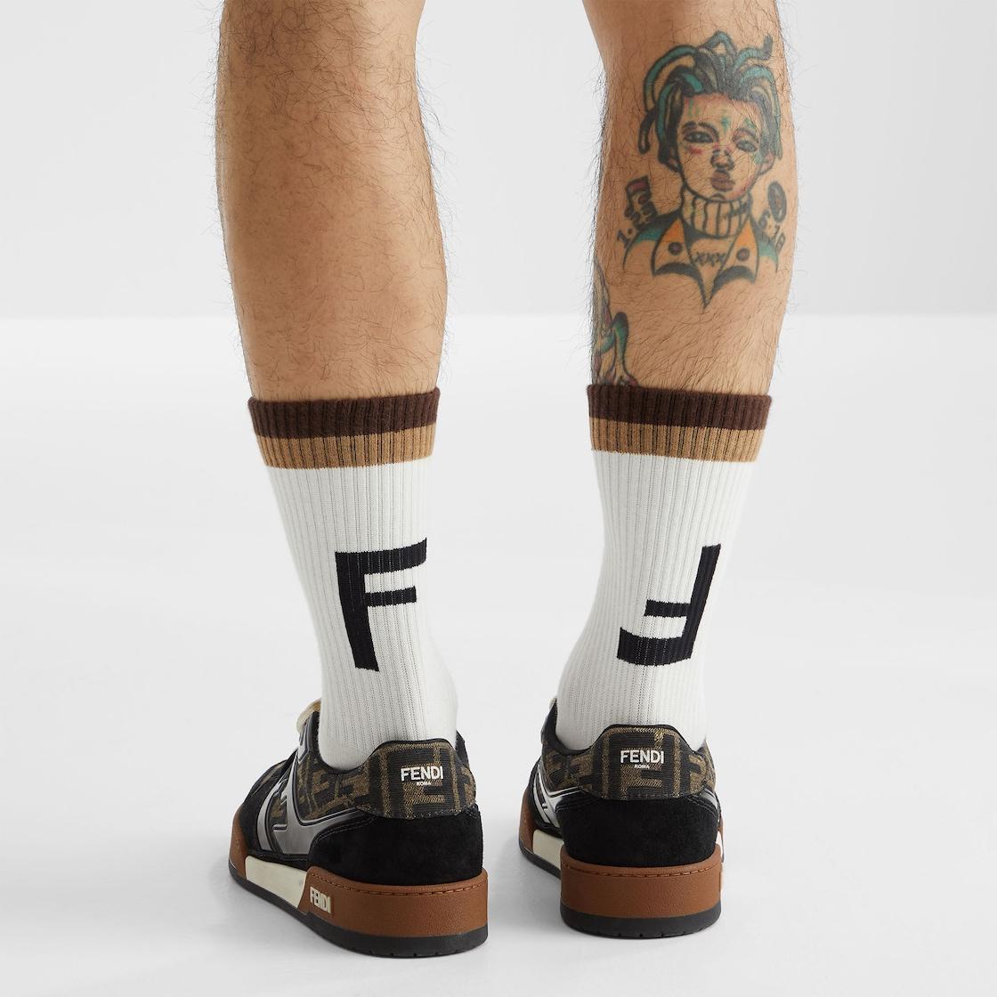 Mid-calf socks. Made in a white ribbed cotton. Trimmed at the edge with a brown Pequin stripe motif and black FF logo inlay on the leg. Made in Italy