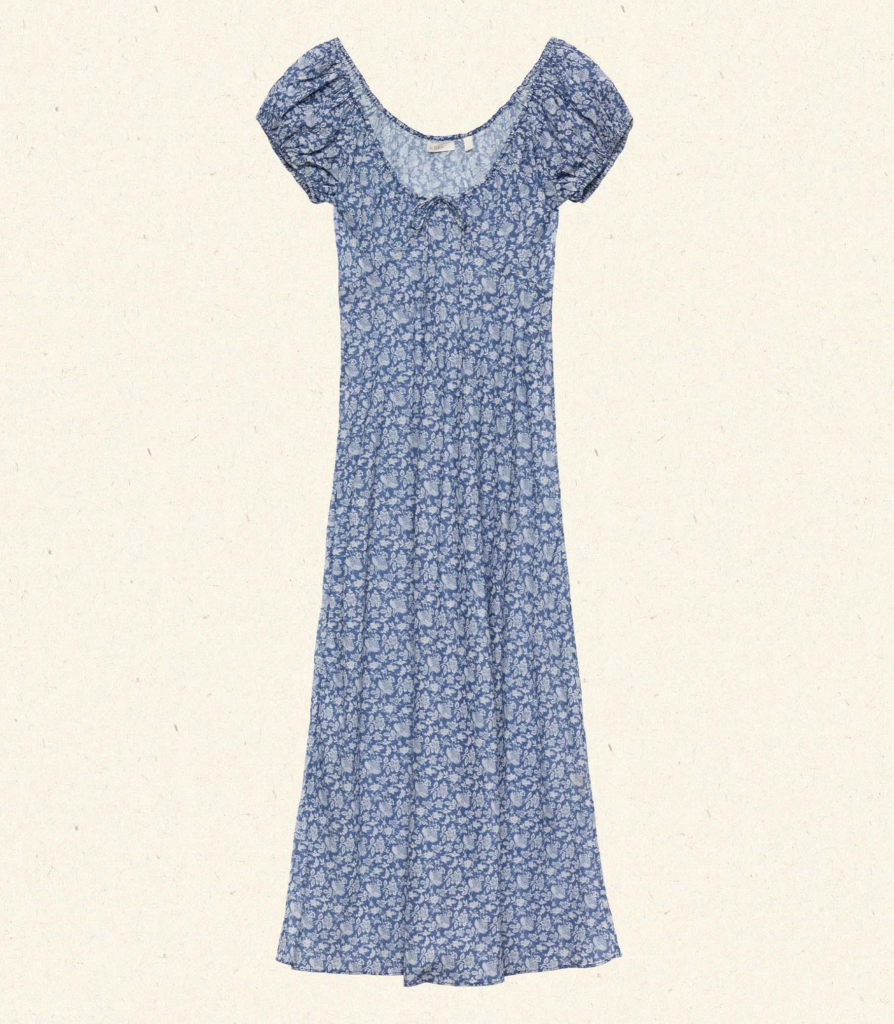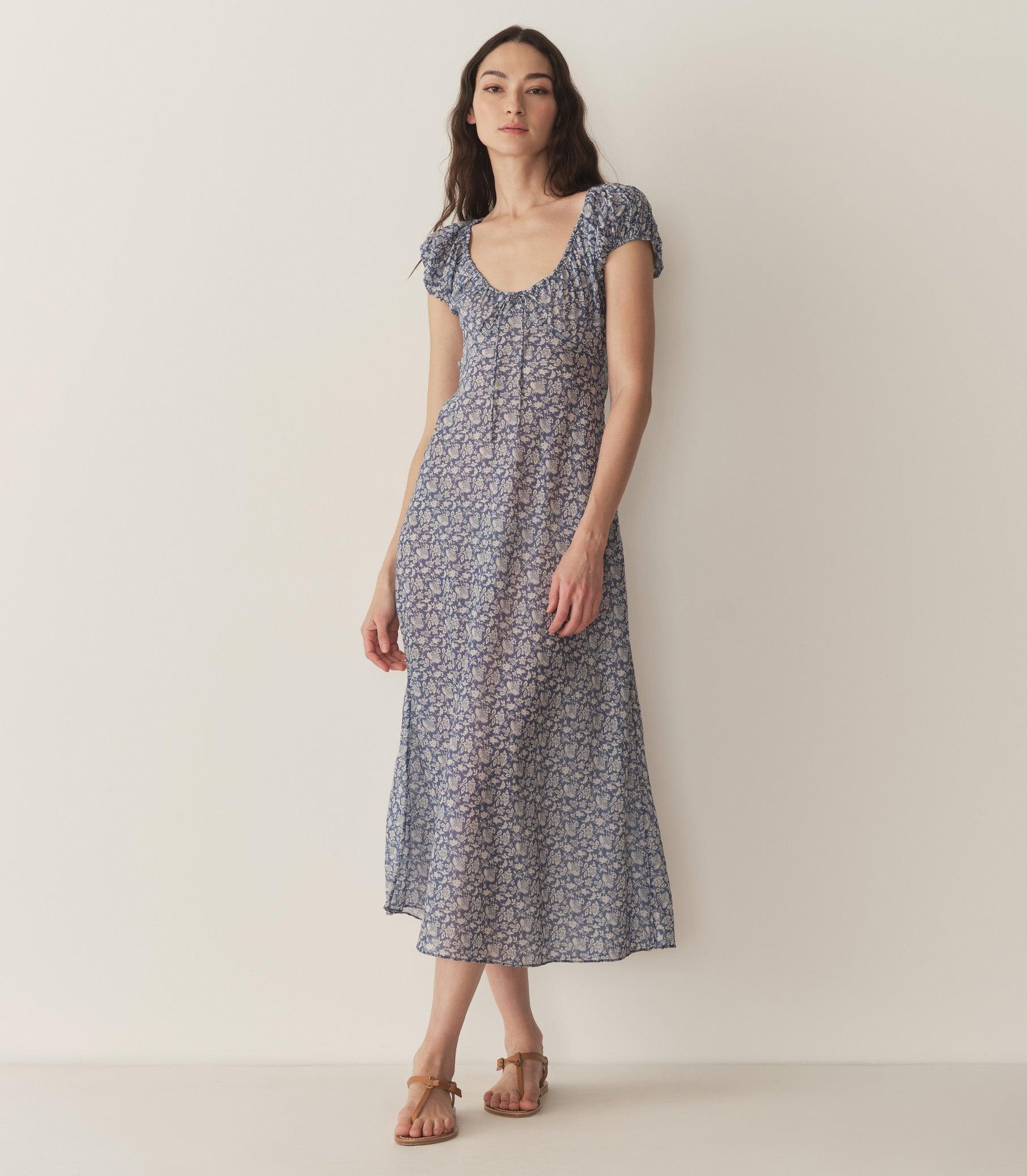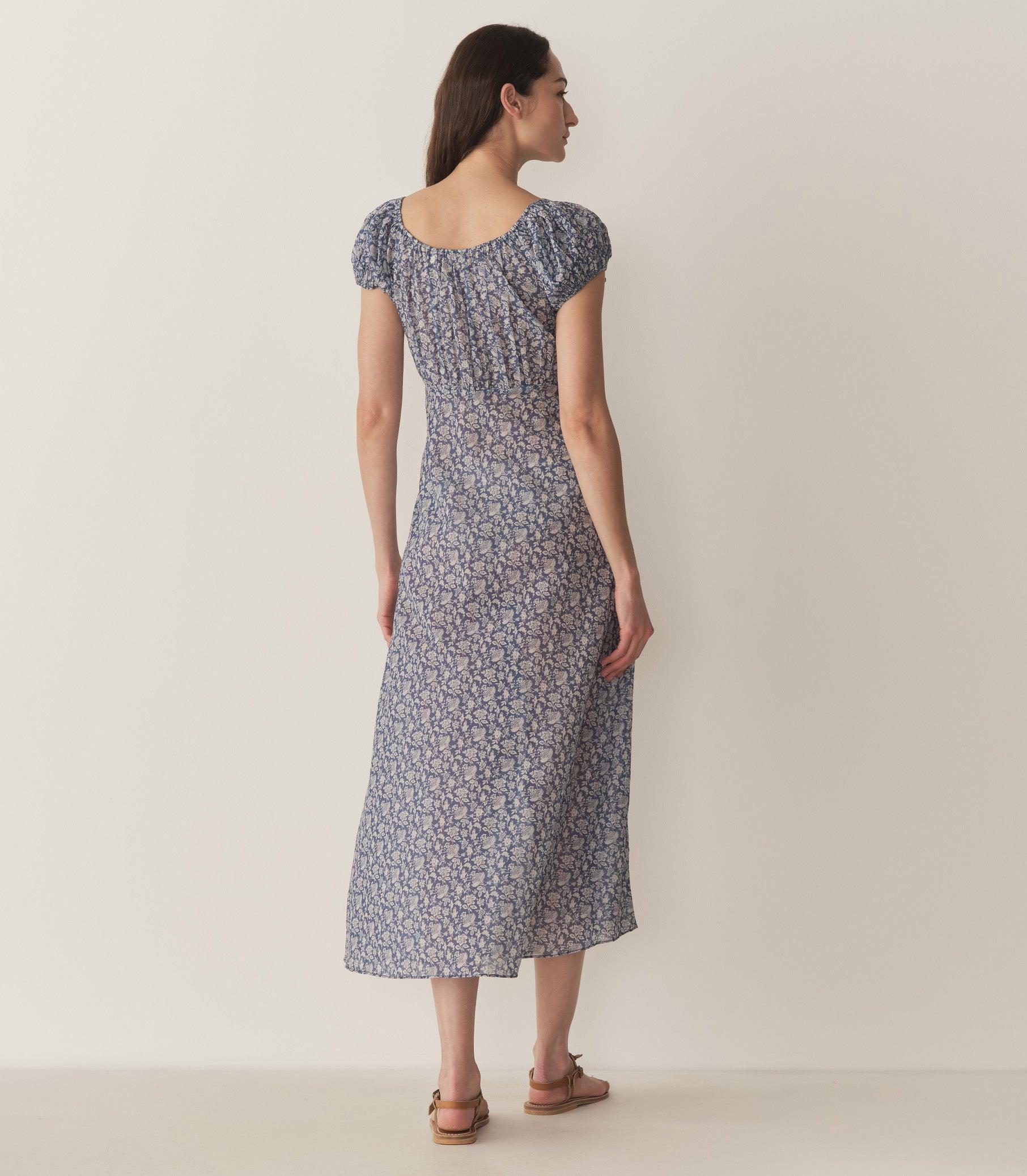 Crafted from a soft, lightweight organic cotton voile, the Sofia Dress returns for Spring, now graced with our beloved Tea Floral—a print we first introduced in 2018, inspired by vintage English chintzes. It features short puffed sleeves, a shovel-shaped neckline with a decorative tie, and a fitted bodice that gives way to an ankle-grazing bias-cut skirt.