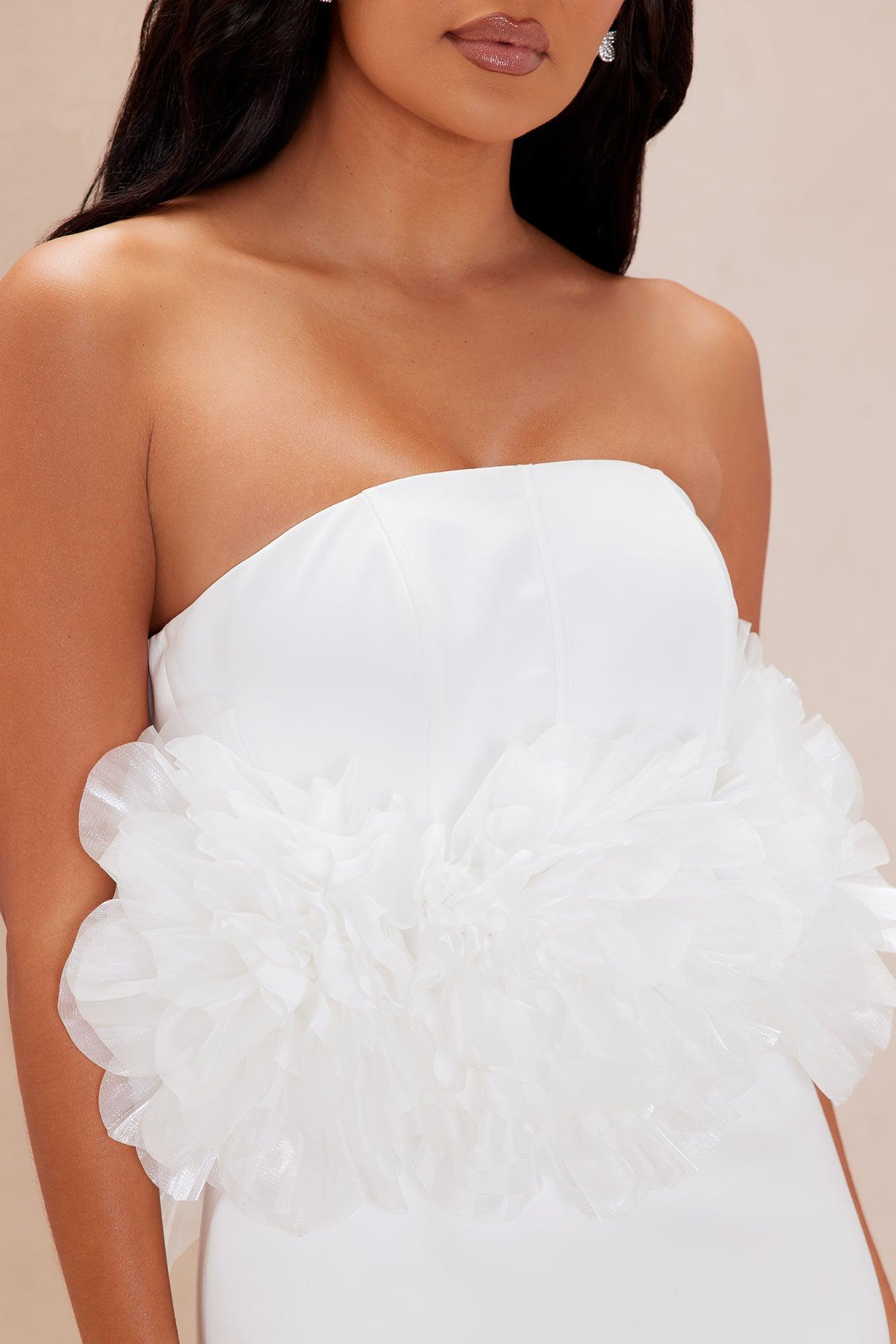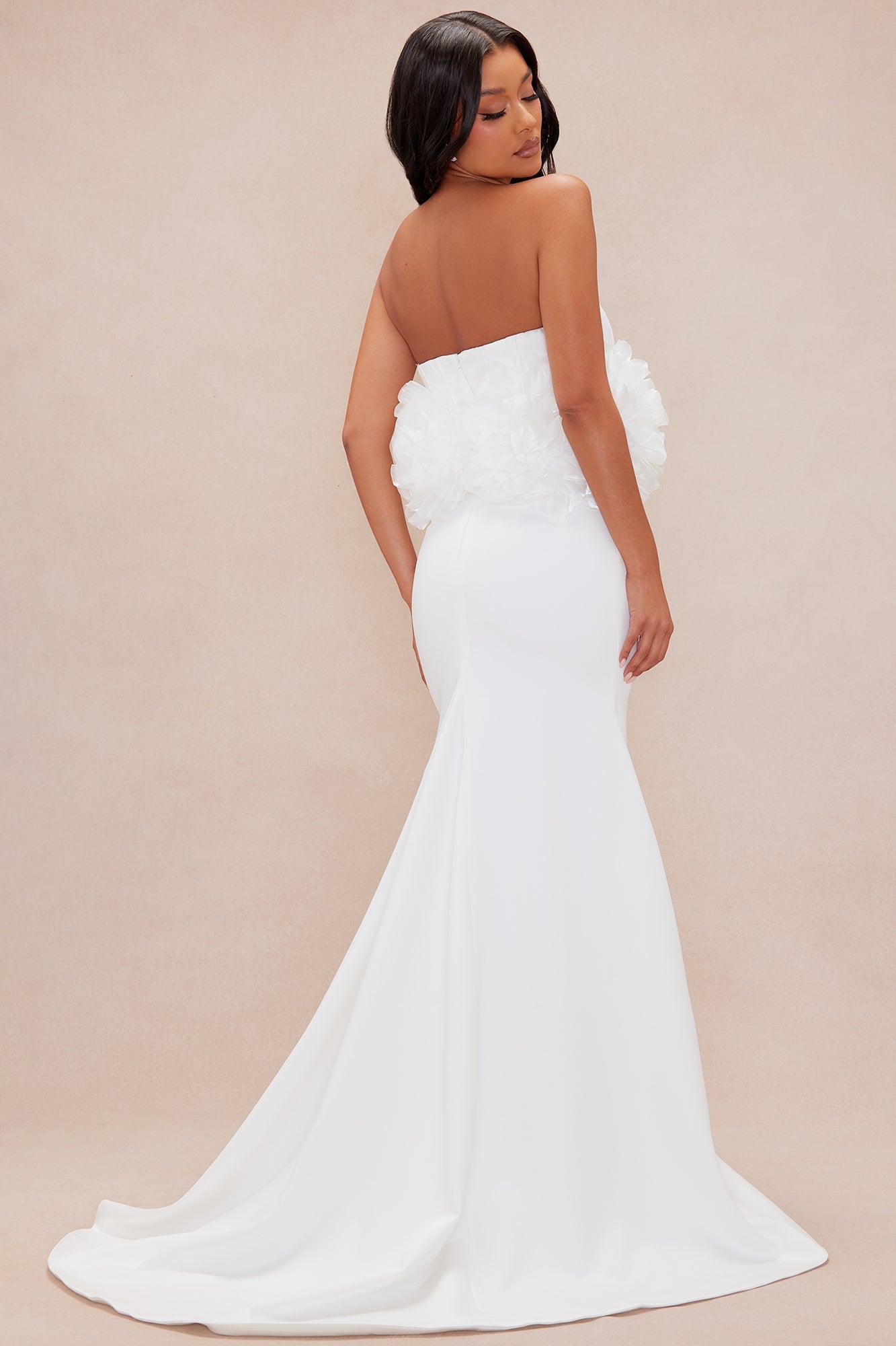 Available In White. Satin Gown Strapless Corset Waist Padded 3D Floral Detail Hidden Back Zipper Lined No Stretch Shell: 95% Polyester 5% Spandex Lining: 95% Polyester 5% Spandex Imported