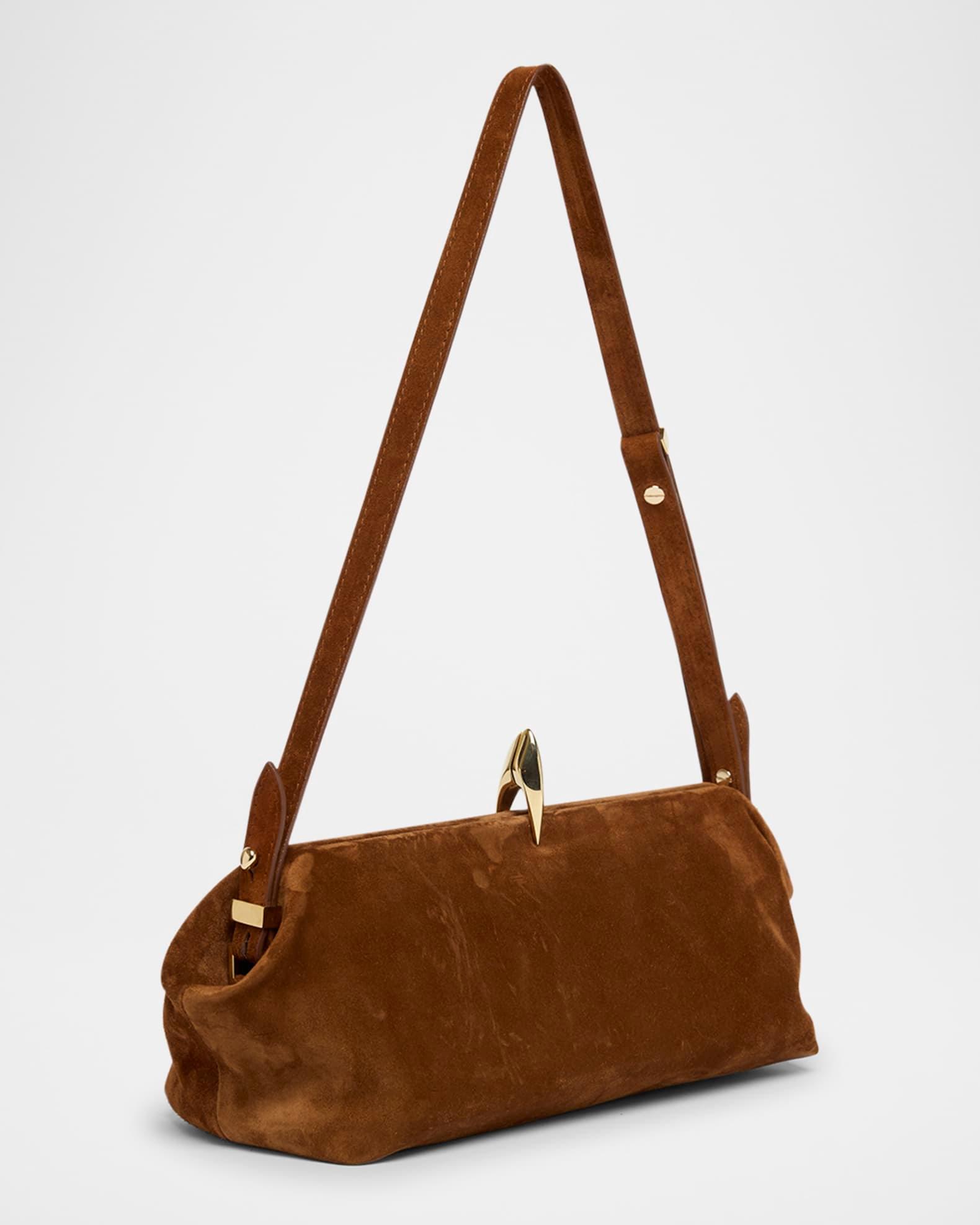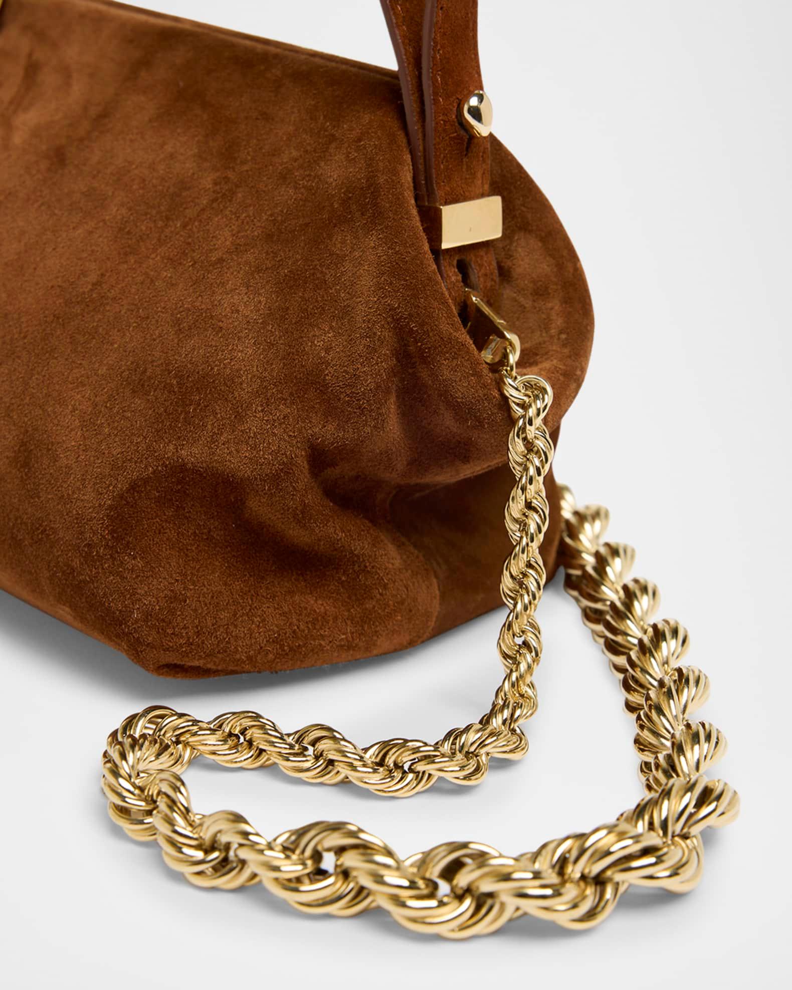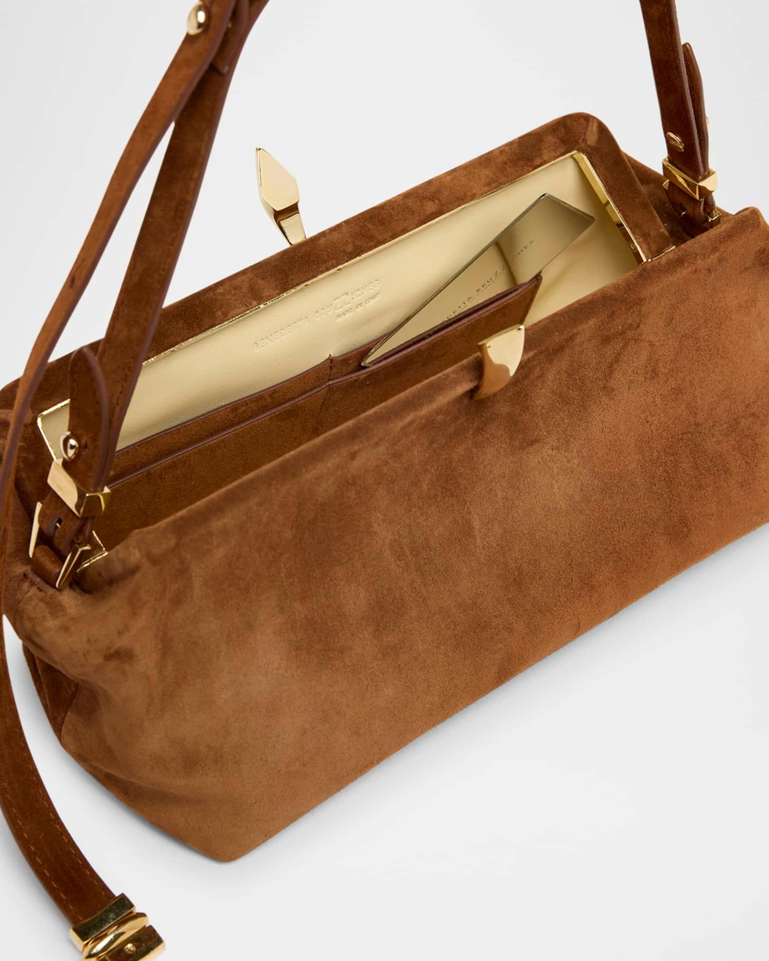 Benedetta Bruzziches "Sofia La Petite" shoulder bag in suede, leather, and aluminum Chain wristlet strap Adjustable shoulder strap Framed top with magnetic closure Interior, two slip pockets Approx. 4.7"H x 9.6"W x 4.3"D Item Weight (Lbs.): 1.5 Professional cleaning recommended Made in Italy