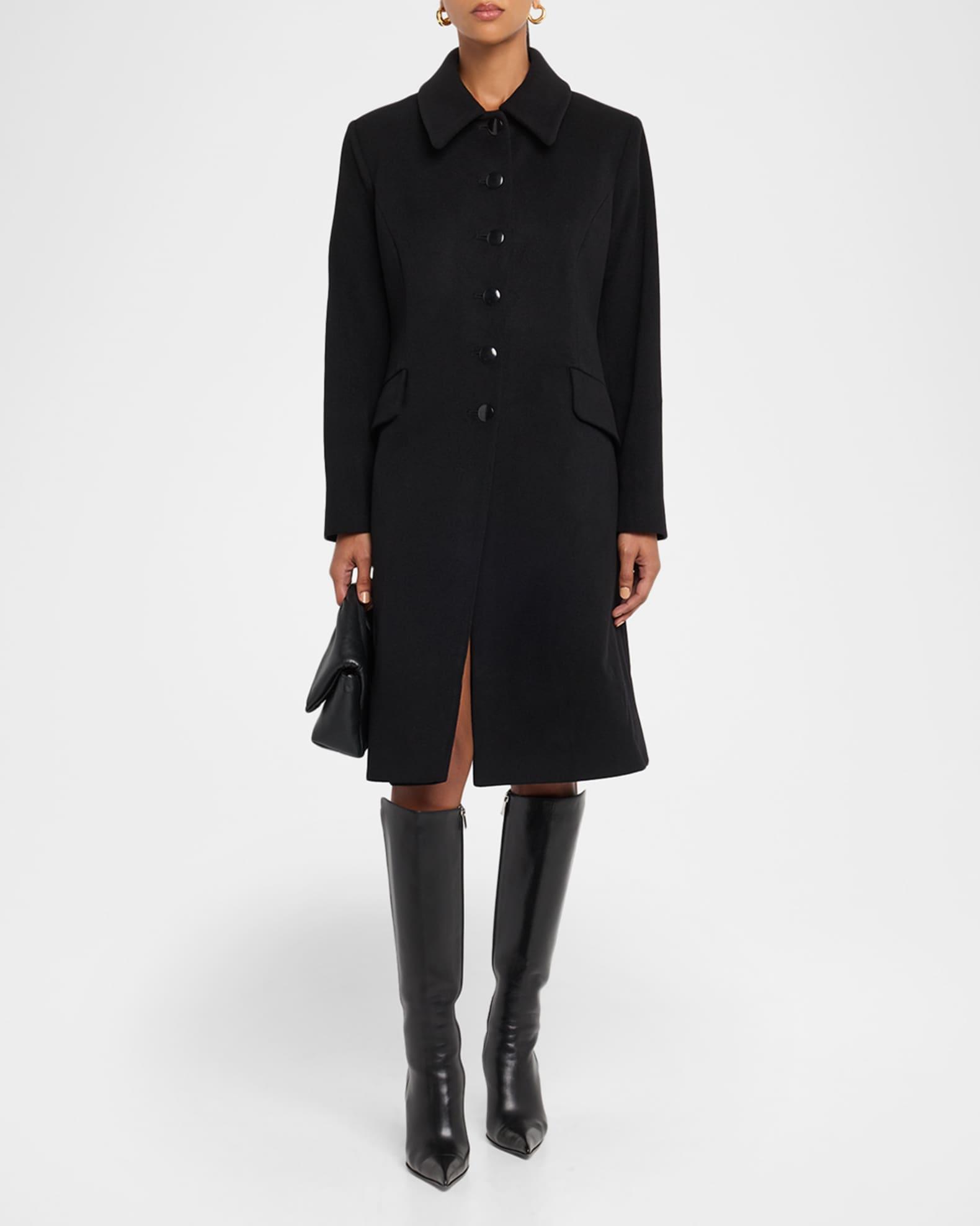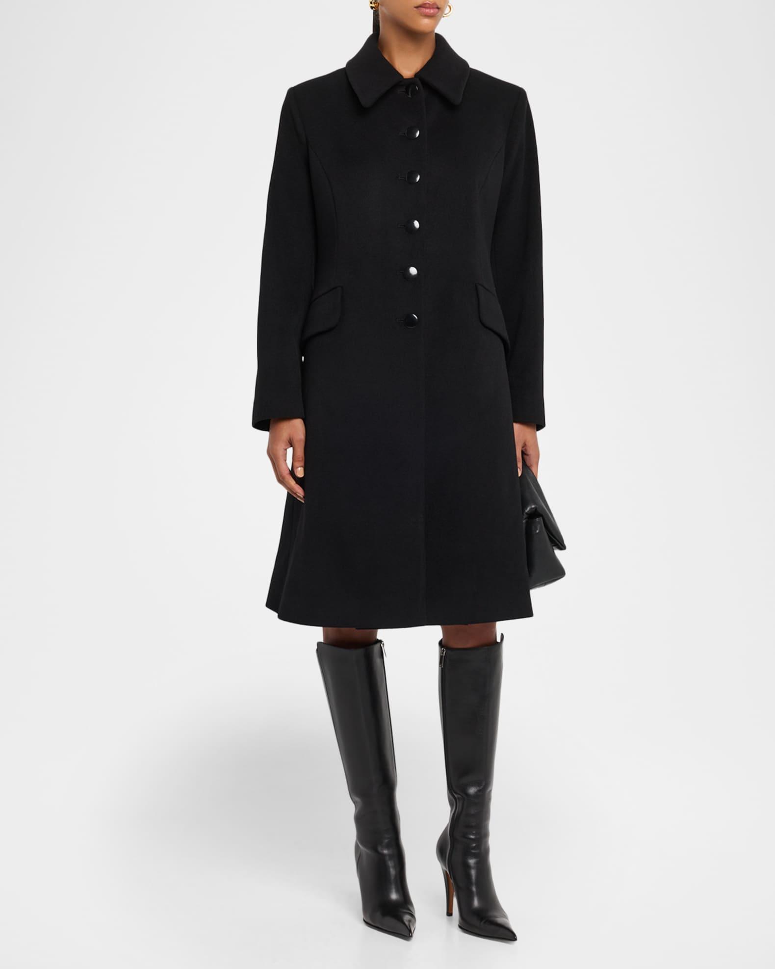 Made in America, the "Sofia" princess coat is crafted from fine Italian wool and features a feminine fit-and-flare silhouette with polished corozo buttons. Point collar Single-breasted front Long sleeves Flap pockets Classic fit Hem hits just below the knee Button-front Wool Lining: Acetate Dry clean Made in USA from imported materials