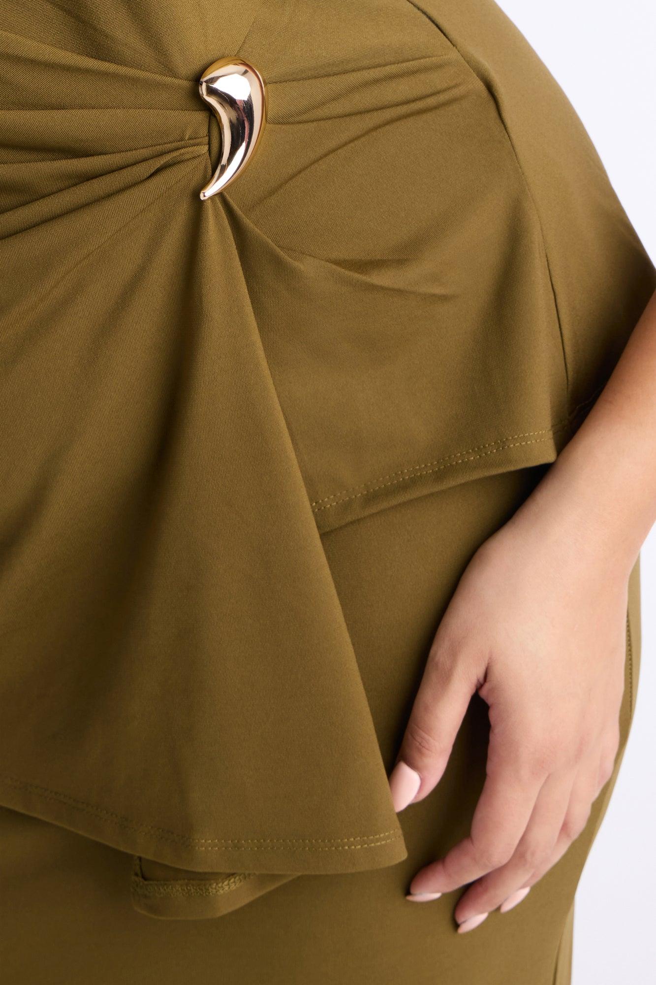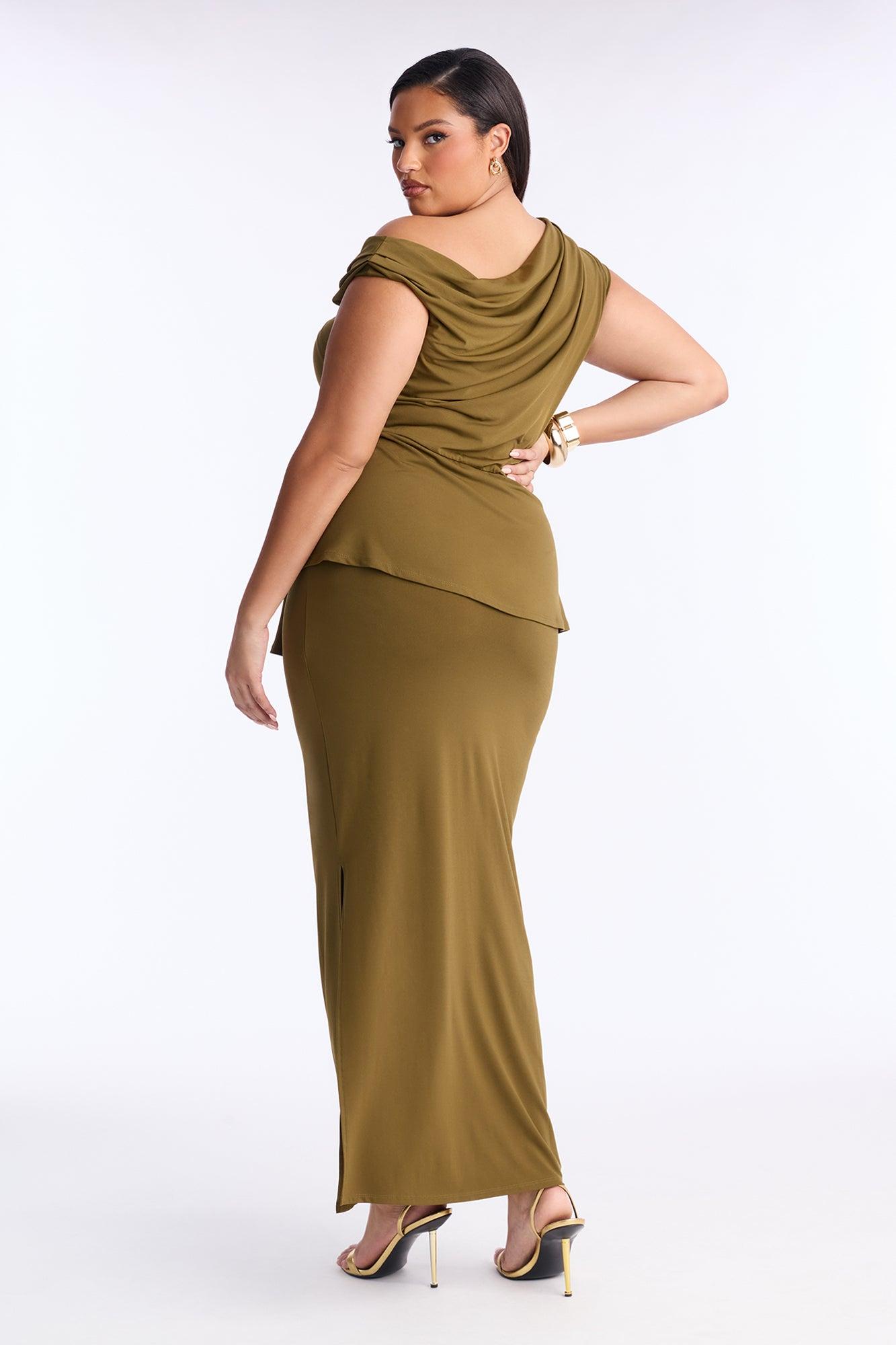 Available In Olive. Maxi Dress Sleeveless Off Shoulder Neckline Ruched Hardware Detail Side Slit Hidden Side Zipper Stretch Self: 95% Polyester 5%Spandex Imported California Proposition 65WARNING: Cancer and Reproductive Harm - www.P65Warnings.ca.gov.