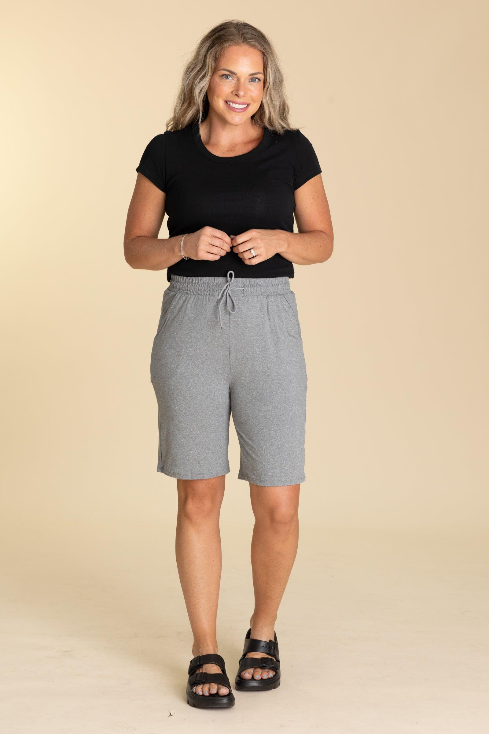 Product Details Color/Wash: Black/ Heather Grey Rise: High Rise Style: Shorts With Elastic Drawstring Waistband Brand: Leggings Depot Material and Care 92% Polyester 8% Spandex Hand Wash Cold Hang/Line Dry Size and Fit Small: Waist 26" Rise 12" Inseam 8.5" Medium: Waist 28" Rise 12" Inseam 9" Large: Waist 30" Rise 12" Inseam 9.5" X Large: Waist 32" Rise 12.5" Inseam 9.5" Erica is 5’7” and wearing her true size medium