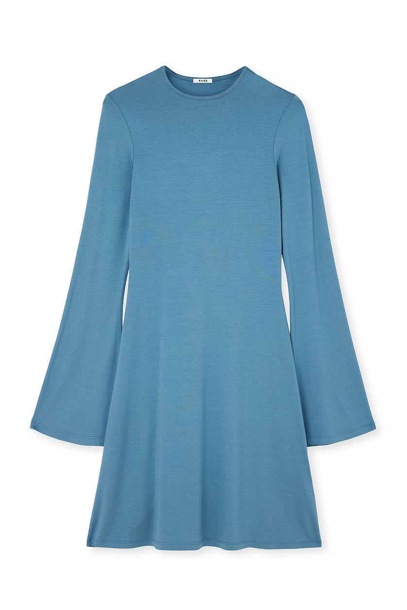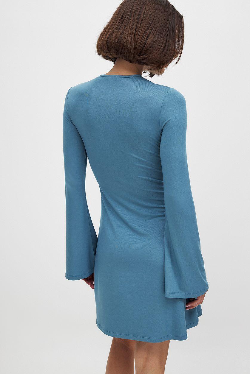 This mini dress features a flowy fit and a soft stretchy material. It has a round neck and long trumpet sleeves.