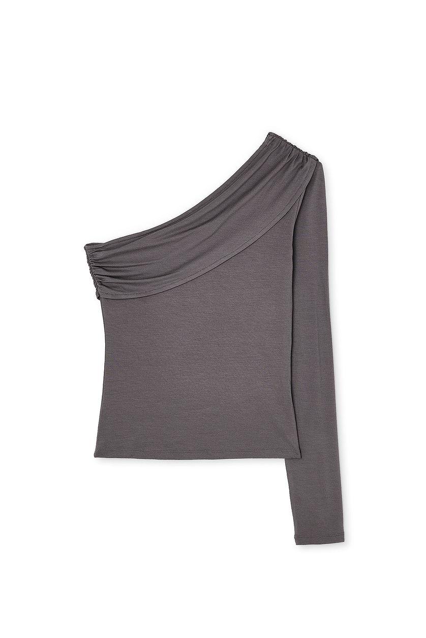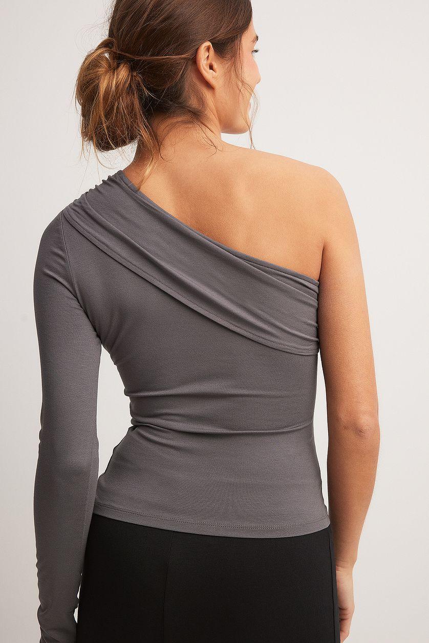 This top features a relaxed fit and a soft stretchy material. It has a one sleeve design and a draped detail.