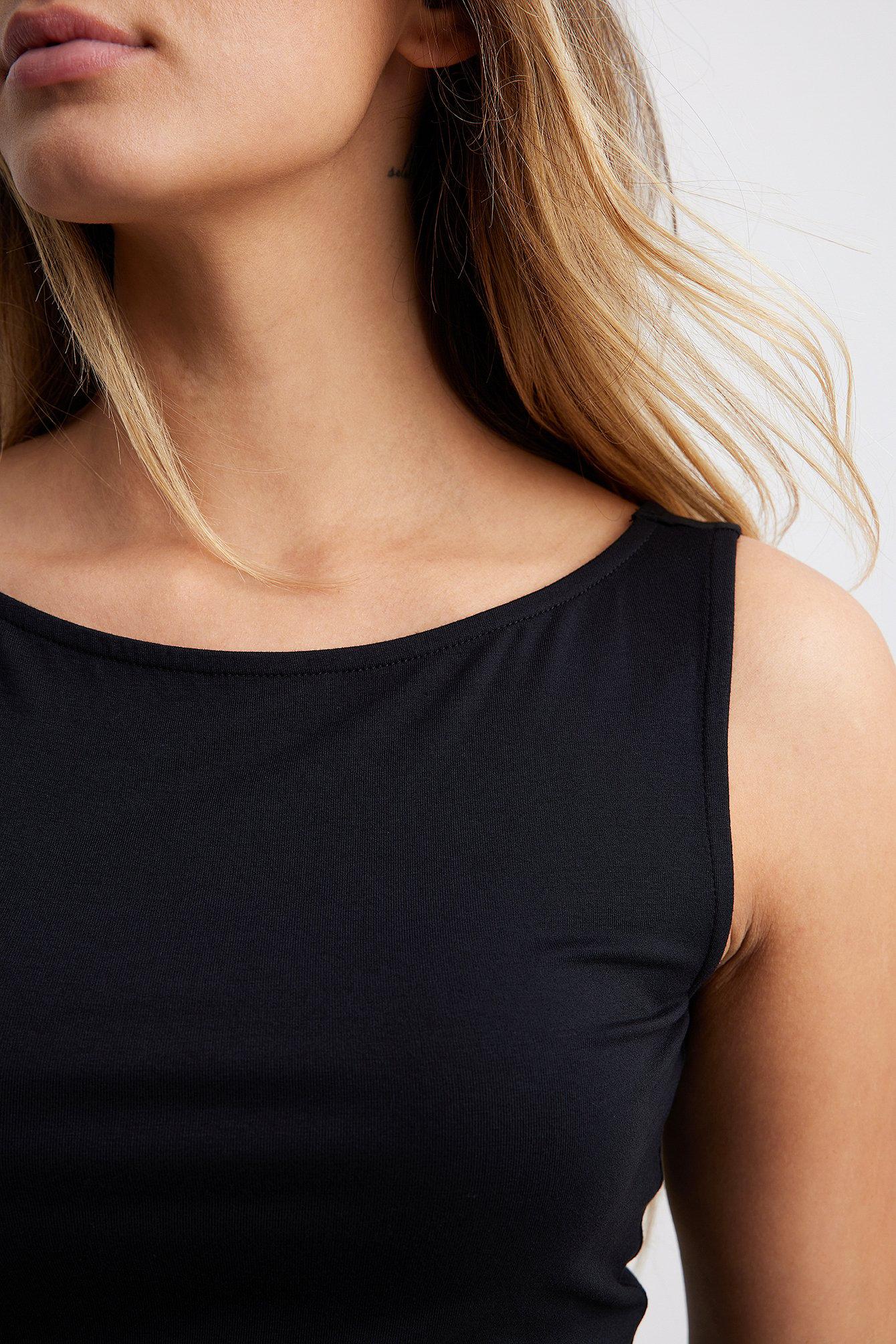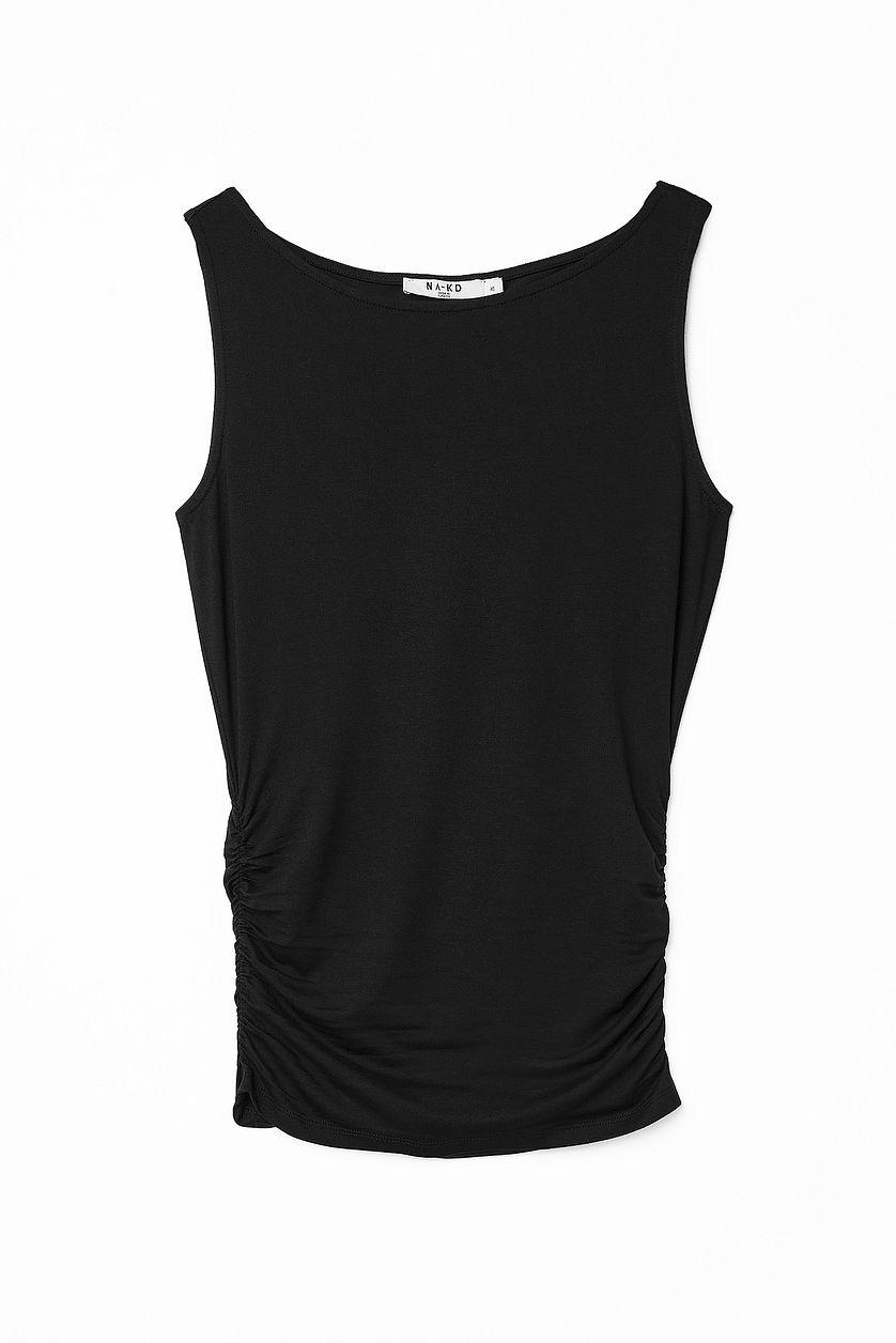 This top features a relaxed fit and a stretchy material. It has a soft touch and a sleeveless design. Our top has a gathered detail on the sides.