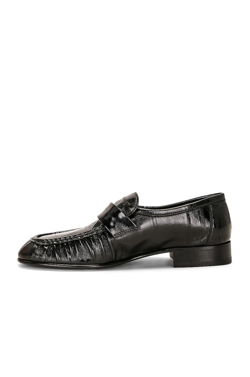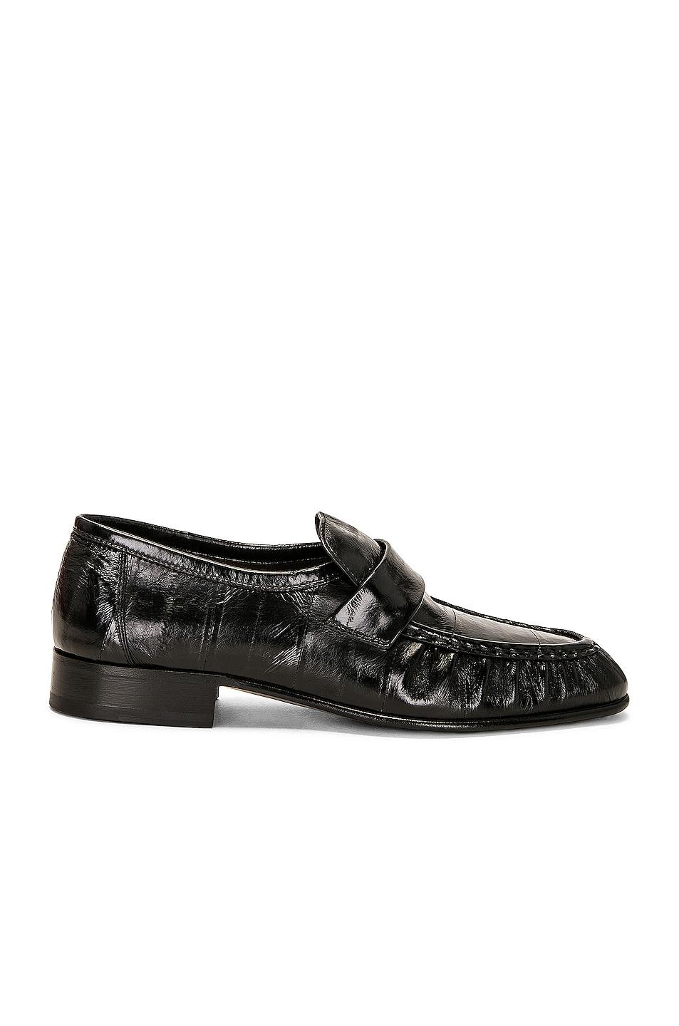 The Row Soft Loafer in Purple Eel leather upper with bovine leather sole. Made in italy. Goat leather lining. Ruched front. Approx 25mm/ 1 inch heel. TERX-WZ274. F1280-E17. About the designer: The Row was established in 2006 by industry icons Ashley Olsen and Mary-Kate Olsen. Named in reverence of London's Savile Row, the fashion house emulates the bespoke standards of exceptional fabrics, impeccable details, and precise tailoring. The Row combines a timeless perspective with subtle attitudes which form an irreverent classic signature. The Row’s collections also explore the strength of simplistic shapes that speak to discretion and are based on uncompromising quality.