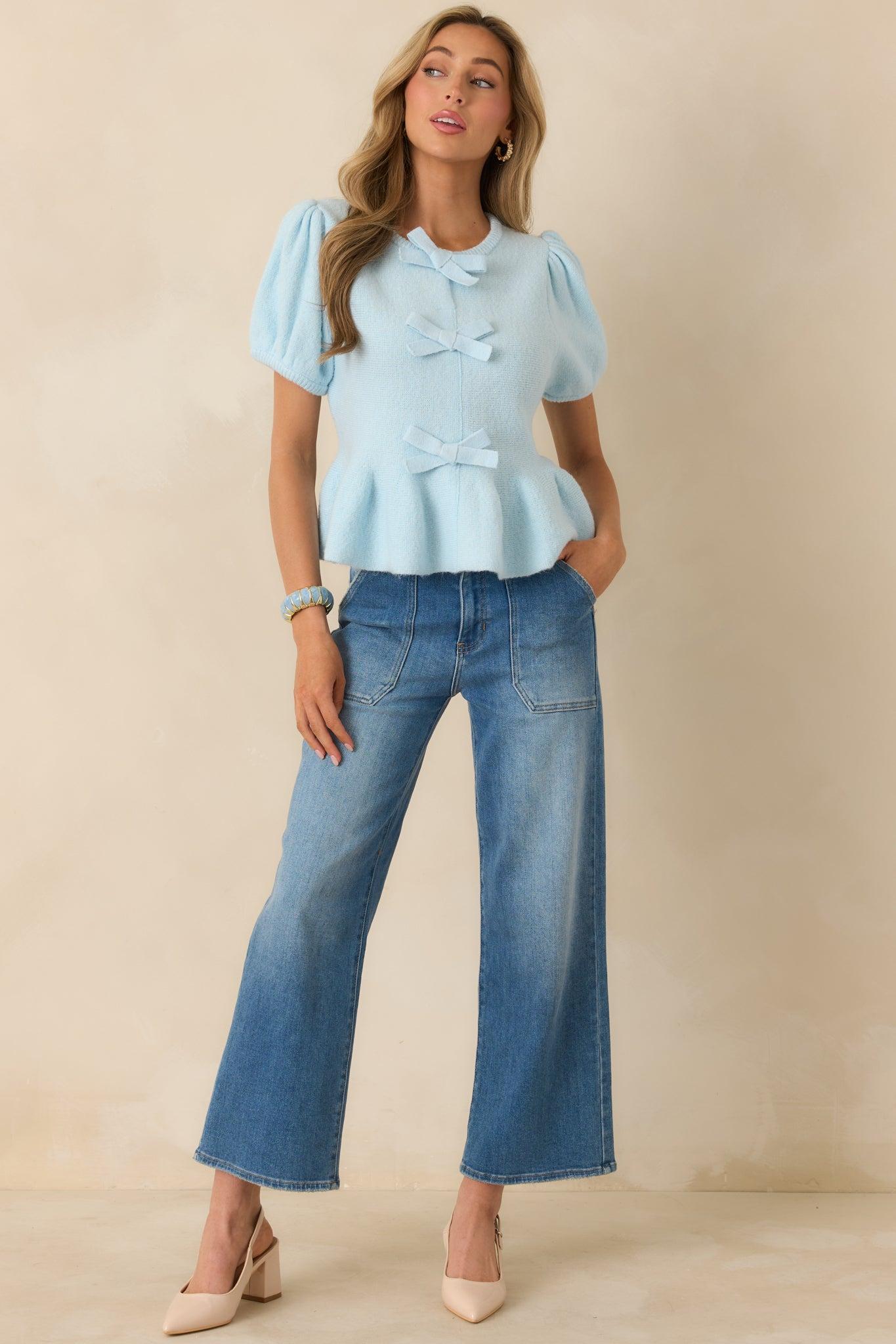 The Soft Spoken Sweetness Light Blue Knit Bow Detail Peplum Top is all about gentle details and romantic charm. The light blue knit sets the tone, while the trio of bow accents adds a thoughtful, feminine touch that feels polished yet playful. Finished with a peplum hem that creates subtle shape, this top feels equally special styled casually or dressed up for something a little sweeter. This light blue knit top features a rounded neckline, short puff sleeves, and three decorative bow details along the front. Designed with a fitted bodice and peplum hem, it offers a flattering silhouette with soft stretch for comfortable wear. 40% Polyester, 40% Nylon, 12% Acrylic, & 8% Wool Unlined Hand Wash Cold Manufactured in China Designed in The USA Model is 5'8" and Wearing a Size Small, Clipped, Model is a True X-Small
