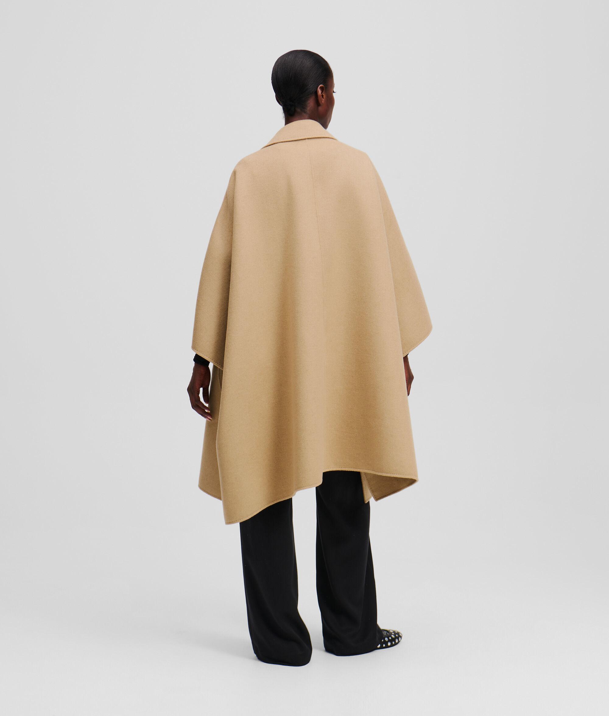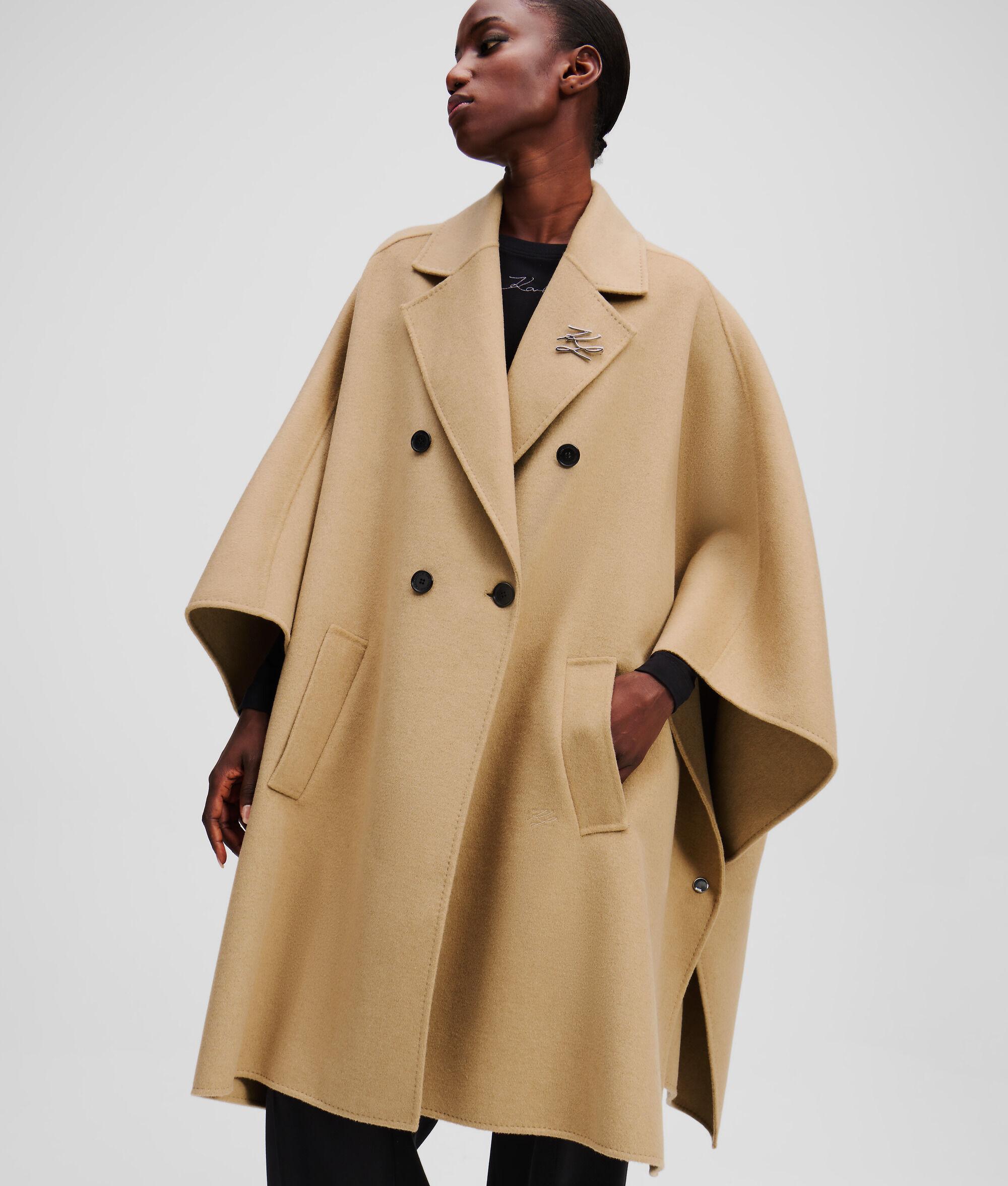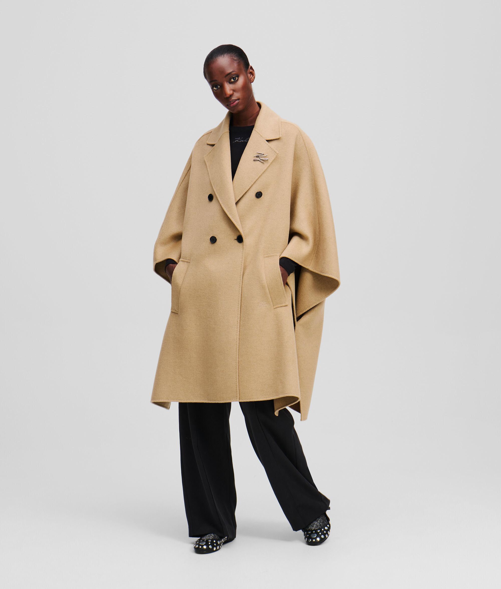 This exquisite cape features a double-breasted silhouette that combines comfort and elegance effortlessly. The branded snap buttons add a touch of distinction, while twin side pockets offer practicality. A detachable metal pin enhances its unique charm, making it a must-have addition to any winter wardrobe.