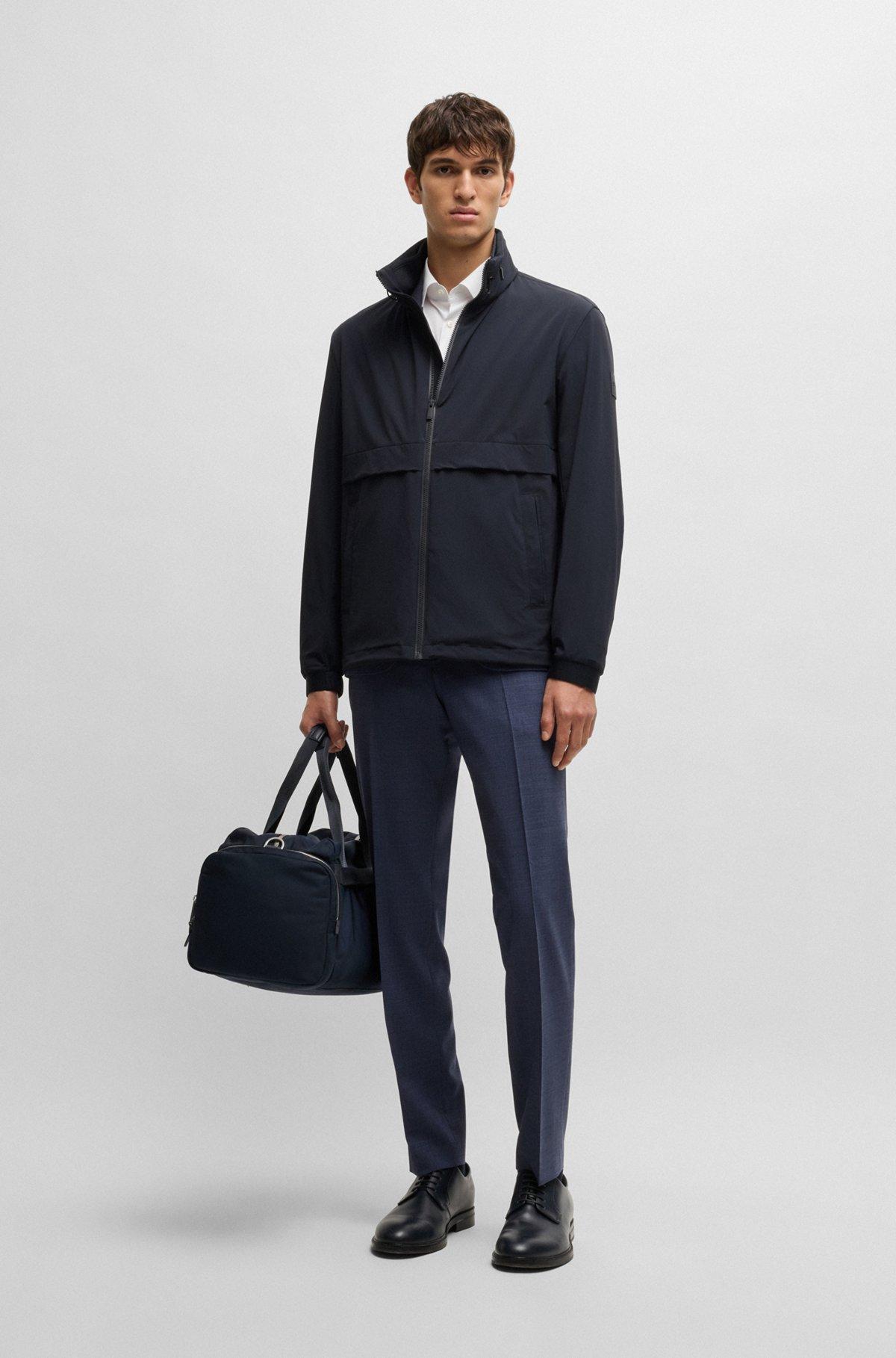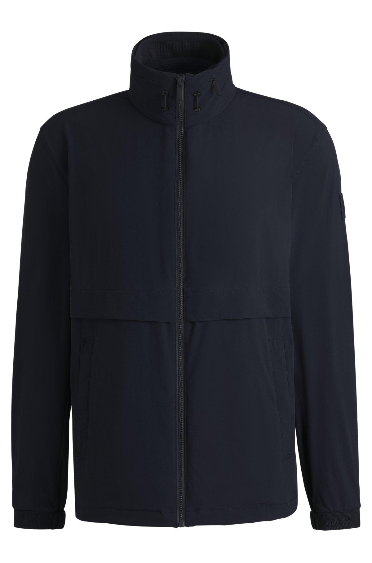 Topped with a packable hood for optional cover, this washable BOSS Menswear jacket is crafted in super-stretch softshell fabric for flexible comfort. Regular fit.