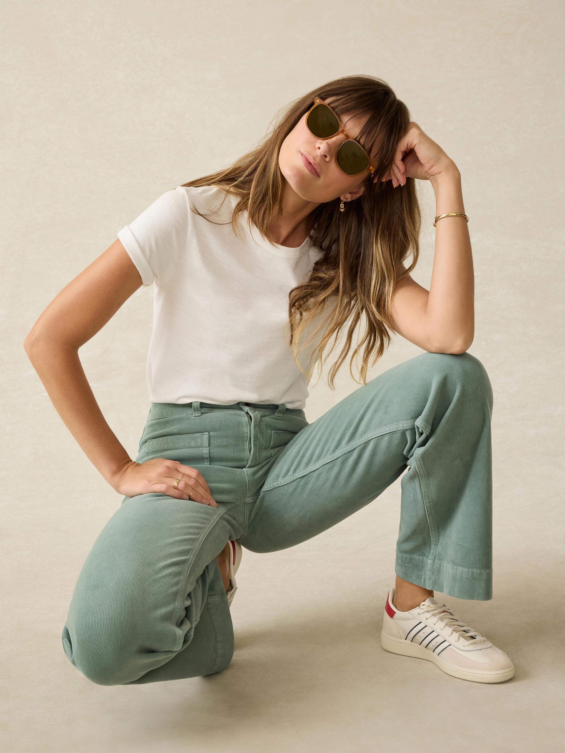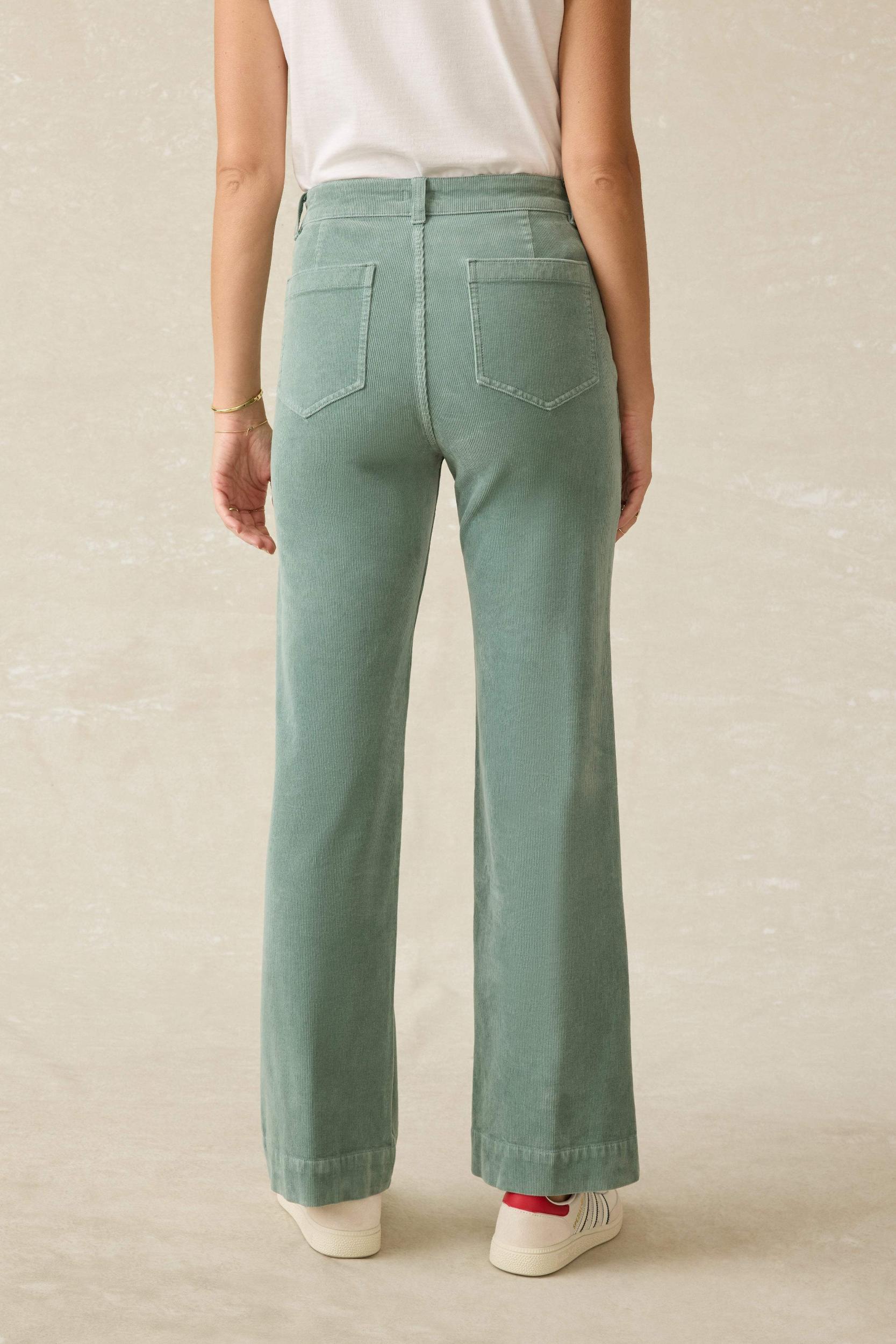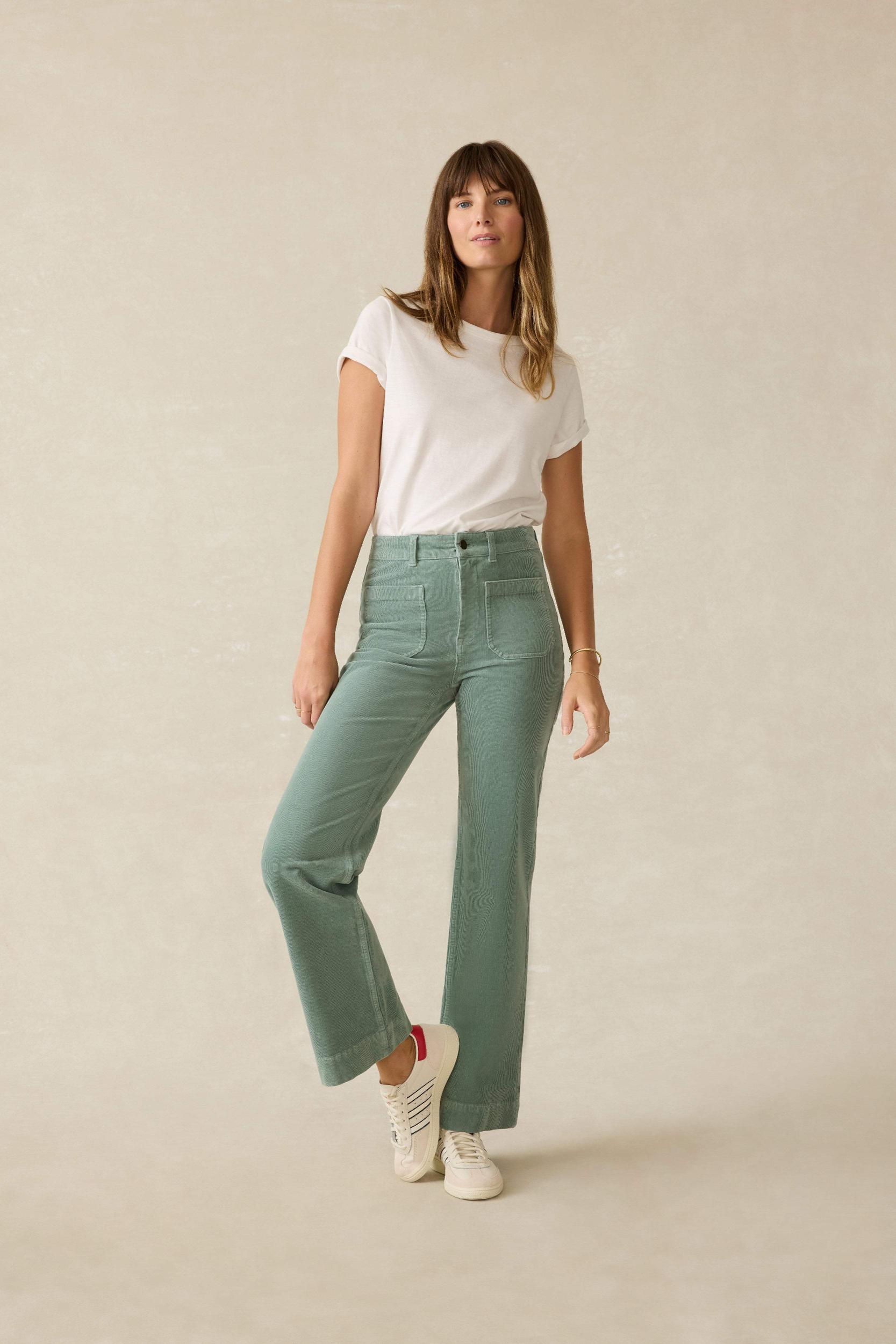 These high-rise pants feature front patch pockets and a flattering flared leg, channeling a chic, laidback retro attitude. But it's our stretch cord fabric that will make these your cooler weather staples. Buttery soft with flexible 4-way stretch, they're endlessly comfortable and perfect for teaming with a crisp button-down for workdays or your fave chunky sweater for laid-back weekend. Fit: Slim through hip and upper thigh, with a wide leg. Inseam 32". Detail: Slim wide-leg pants with patched front and back pockets. 4-way stretch corduroy. Garment dyed. Material: 97% Organic Cotton, 3% Elastane. Faherty text simple shank. Metal zipper fly. Model: Ava is 5'10 wearing size 26 Care: Close all fastening before wash. Turn inside out. Machine wash cold with like colors. WBF2452-EGA