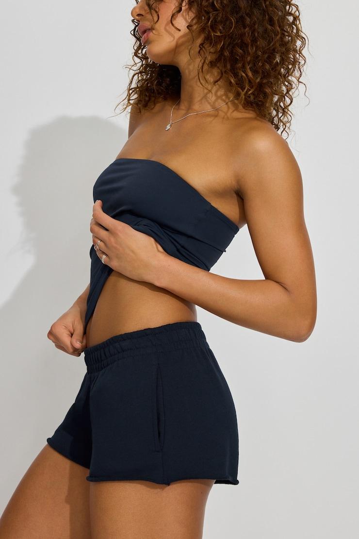 90's babies know the drill! Kick it in these soft terry low rise shorts! Features Booty short Raw edge 2-pocket detailing Size & Fit Rise: Low Length: Mini Inseam: 2" Model is wearing size S Materials & Care Content: 100% cotton Care: Machine wash, cold Imported