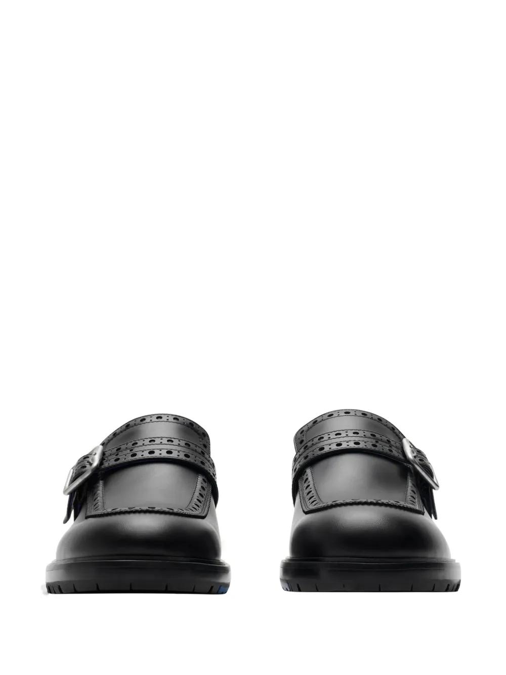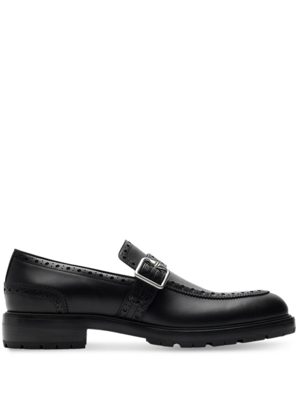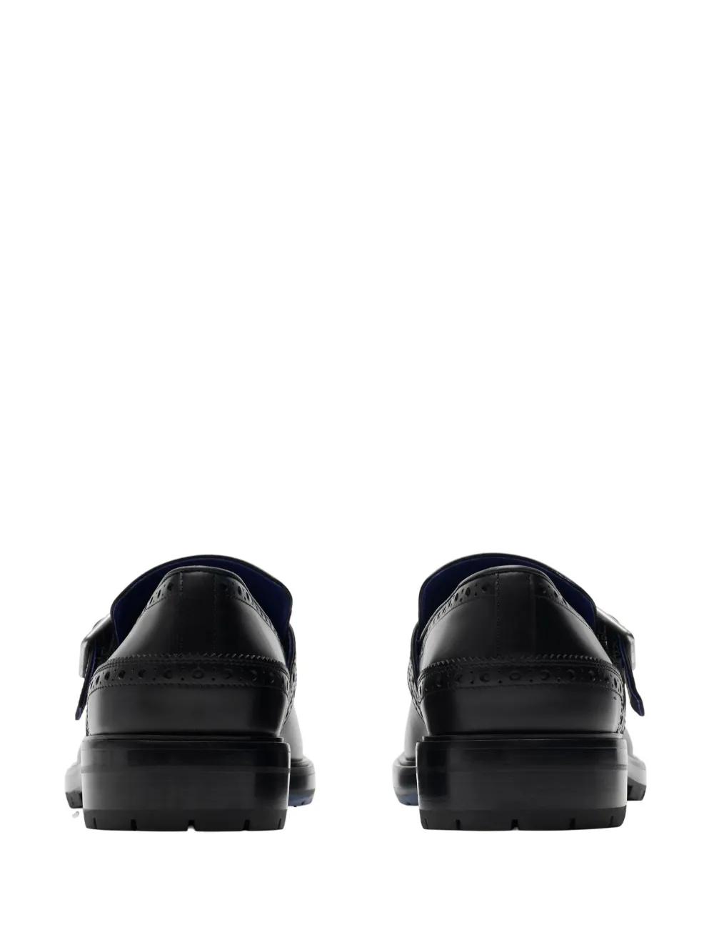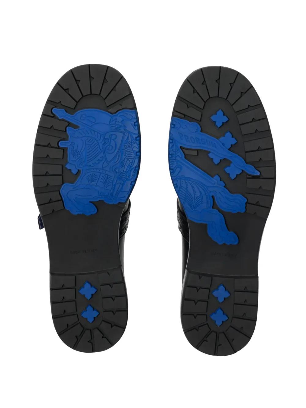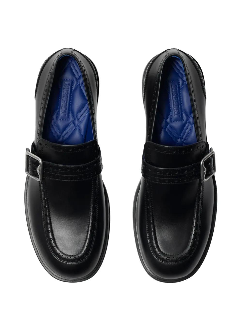 Shop Burberry Soho Leather Loafers In Black from 600+ stores, starting at $527. Italian-made loafers in smooth calf leather punctuated with brogue detailing. The style features an adjustable B buckle strap and our Equestrian Knight Design at the sole. Rounded toe B buckle hardware Quilted leather insole Equestrian Knight Design at sole Comes with a dust bag Upper: 100% calf leather Lining: 95% calf leather, 5% goat suede Sole: 100% thermoplastic polyurethane Made in Italy
