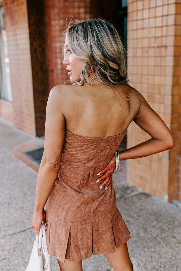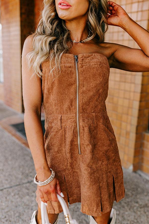 - Step into effortlessly trendy style with this corduroy romper dress! The chic zippered front adds a touch of edge, while the pleated detailing on the skirt keeps it flirty and feminine. Perfect for a day out or a casual evening, this romper dress gives you that cute-meets-cool vibe. - Corduroy material - A strapless neckline with an interior non-slip strip - A zippered front ending below the waistline - Belt loops - Functional side pockets - Soft built-in shorts - A flattering silhouette that ends in a pleated upper thigh length hemline
