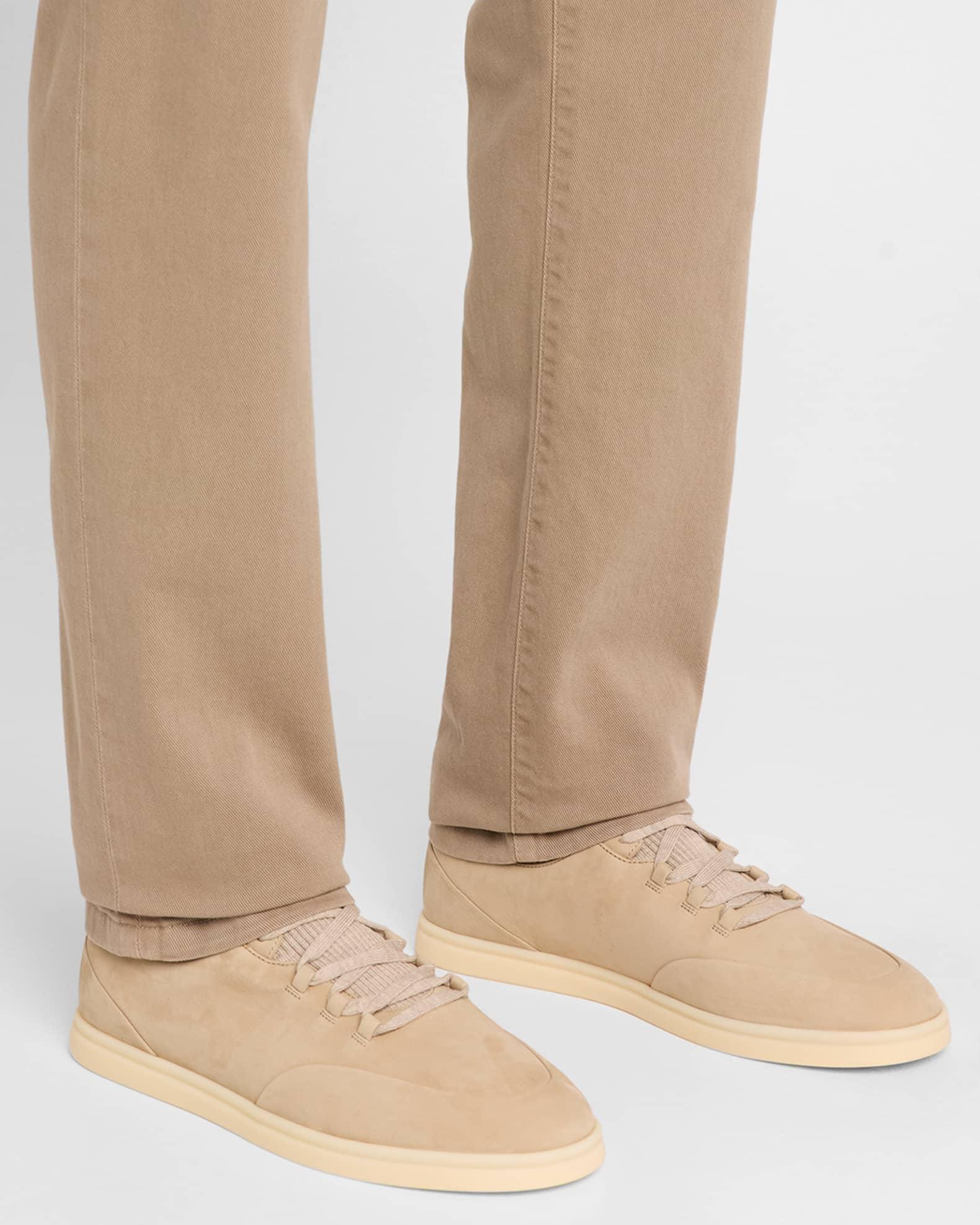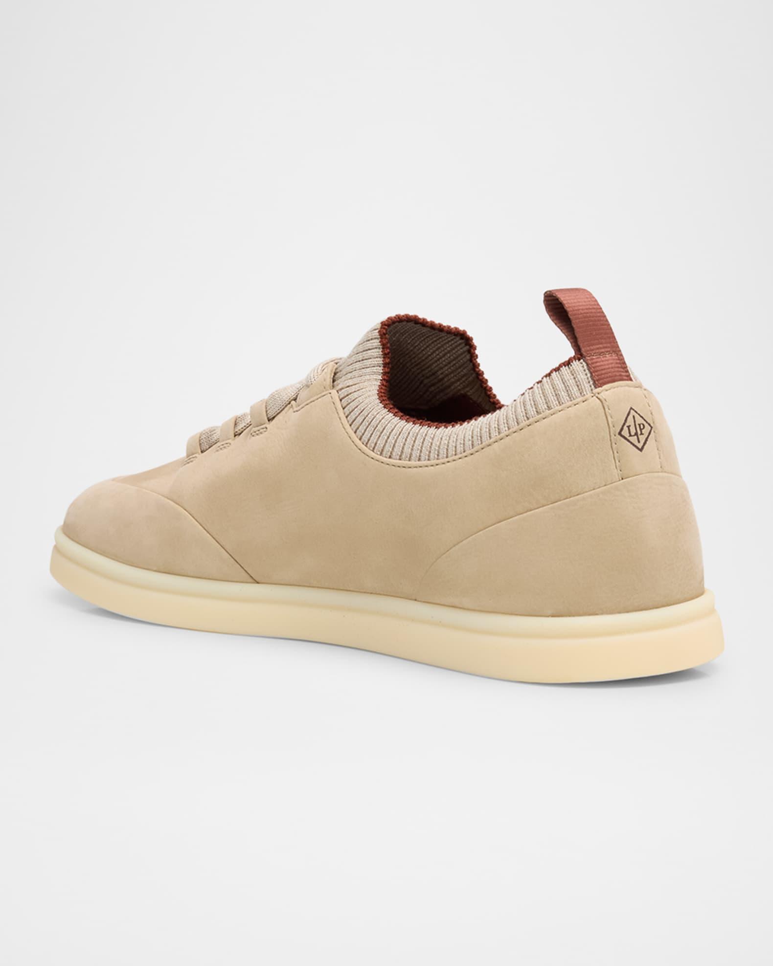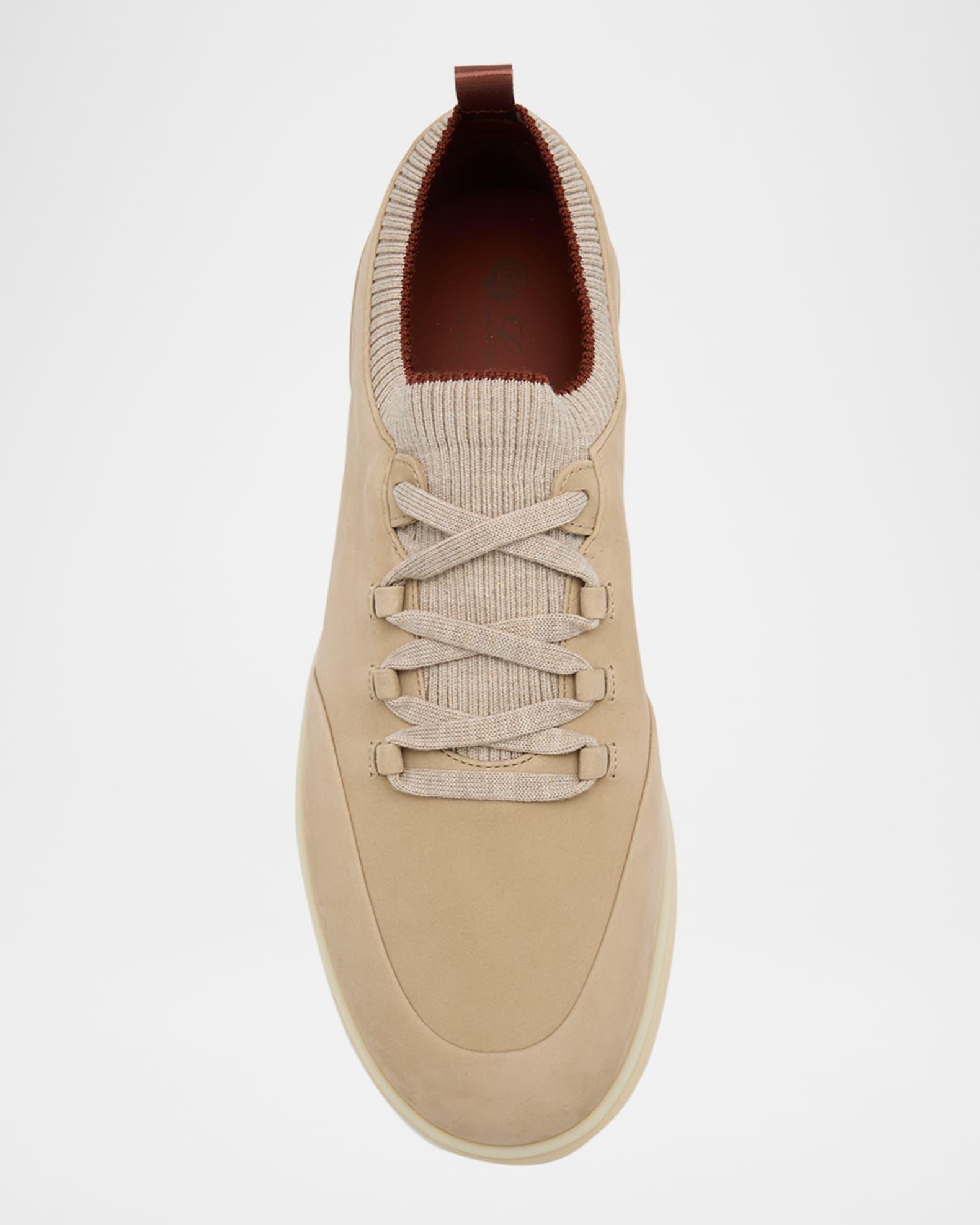 Loro Piana Soho Walk grained nubuck sneakers with rib-knitted wool trim. Flat heel. Round toe. Lace-up vamp. Sock-like collar. Pull-tab at backstay. Made in Italy.