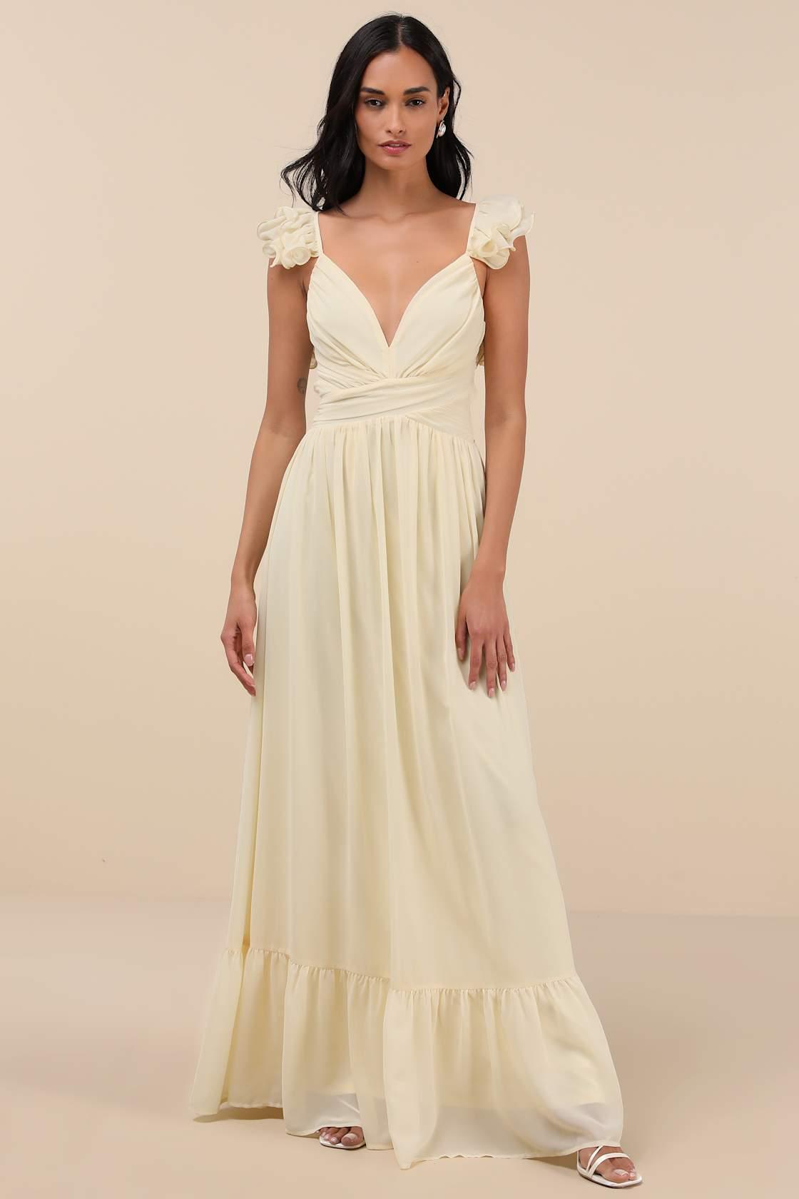 When the cocktails are poured and the music starts playing, you know it's time to slip into the Lulus Soiree Celebration Light Yellow Ruffled Lace-Up Maxi Dress! Airy woven chiffon shapes this romantic gown that has ruffled-adorned straps and a plunging V-neckline, with an open back accented by slender laces. Banded waist has a gathered, crossover design, above a sweeping skirt that falls to a maxi hem. Hidden zipper/clasp at back.