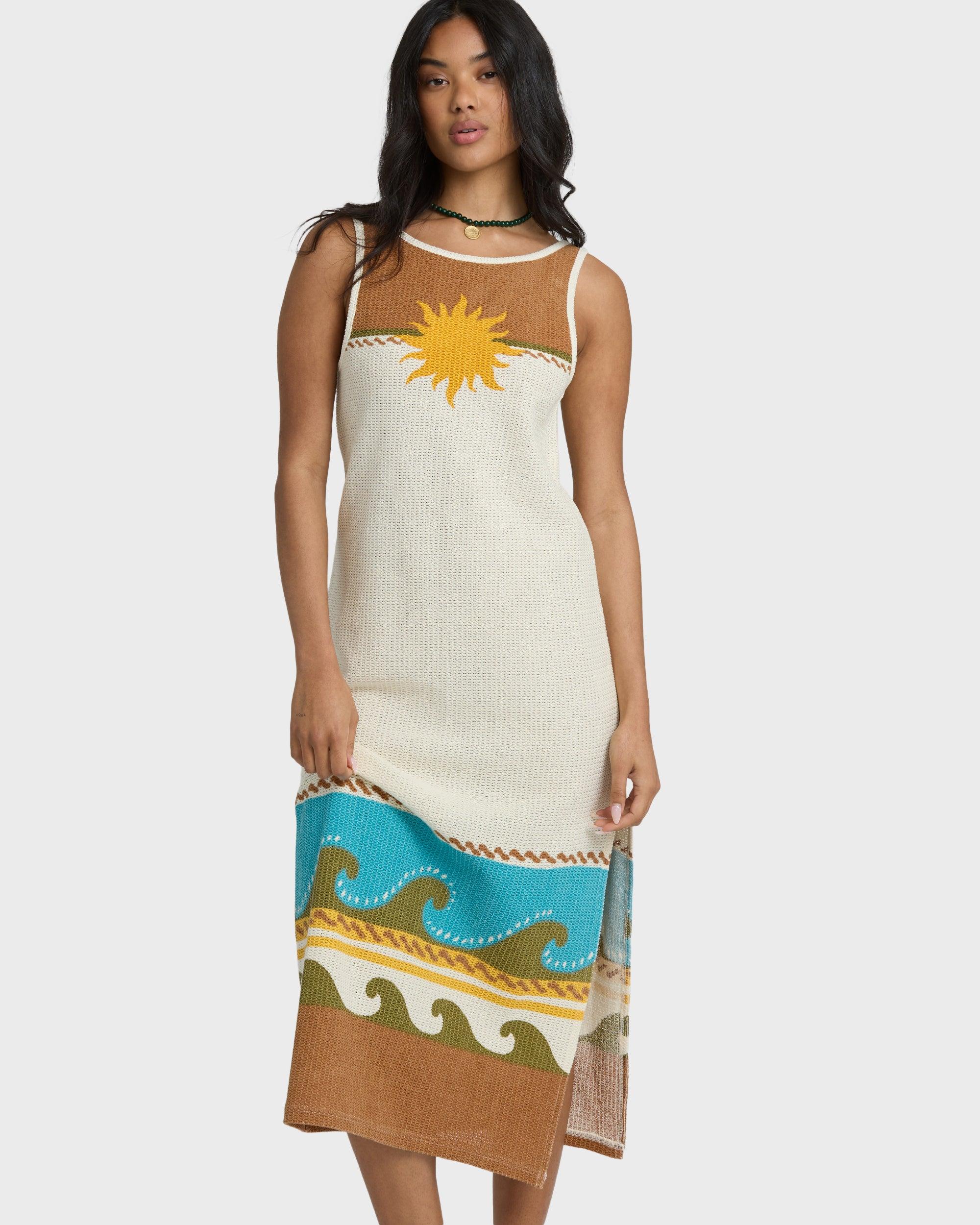 Step into sunny style with our cotton faux crochet midi dress. The scoop neckline (front and back) frames your silhouette beautifully, while the eye-catching placement print adds character. Finished with a subtle metal plate detail for that perfect touch of sophistication. Features Fabric: 100% cotton faux crochet, placement print Type: Midi dress Fit: Scoop front and back neckline Features: Metal plate