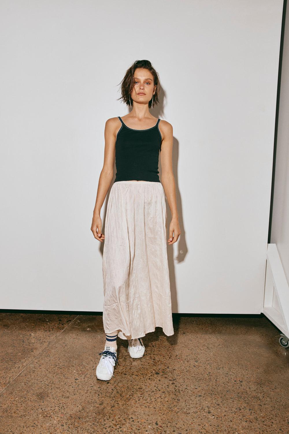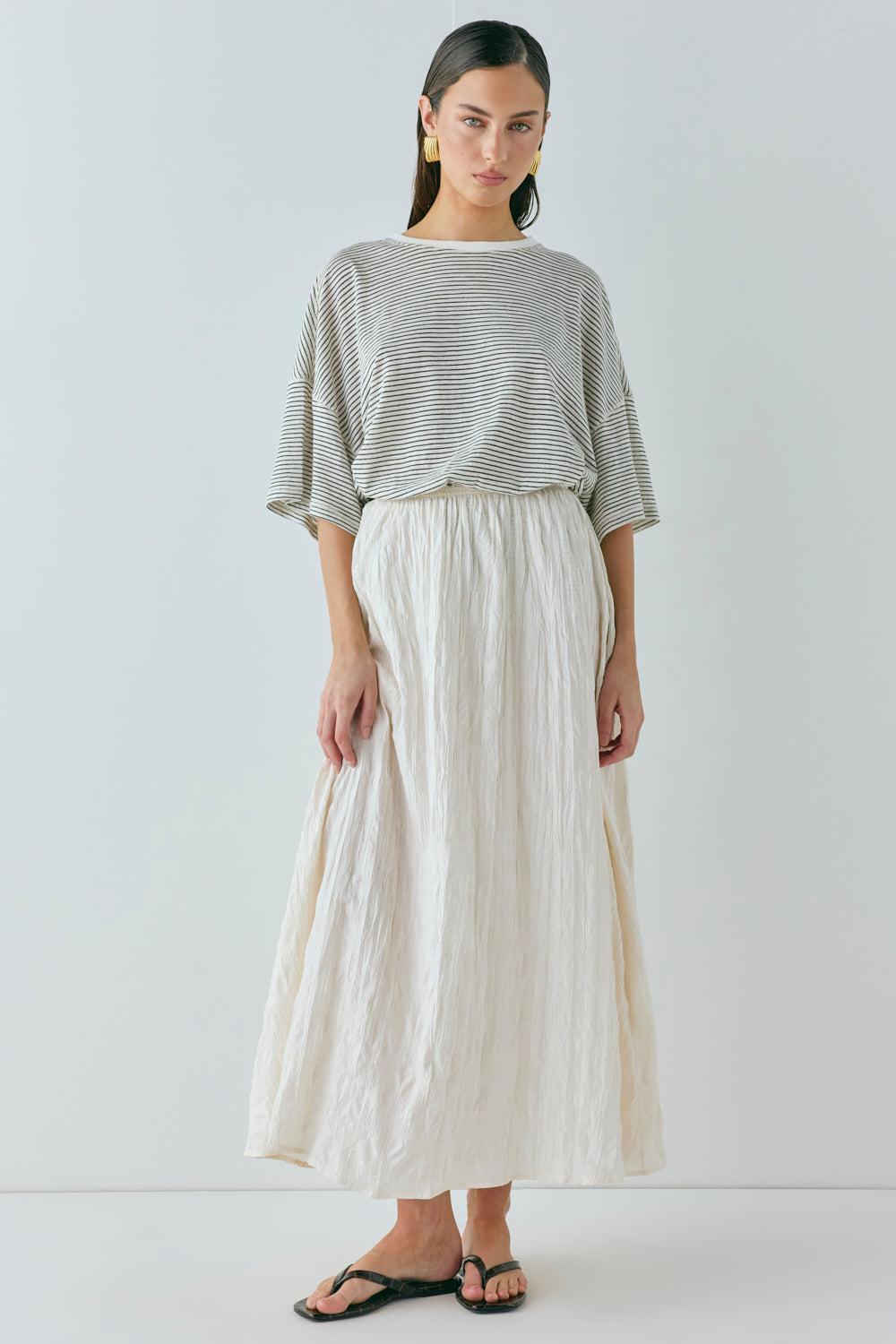 Meet our best selling Solara Midi Skirt in Cream. It feels lightweight and flowy to wear and is made from a crinkle textured fabric. Featuring an elastic waist and being an A-line cut means this is a wearable and flattering style that suits all body types. Details 100% Polyester Crinkle texture Elastic waist Length 92cm / 36in (taken from a size AU 8 waist to hem) Cold Hand Wash / Cool Iron Designed in Australia Size & Fit Sanne is 177cm / 5ft 9.5in wearing size AU 8 View our size guide for more information