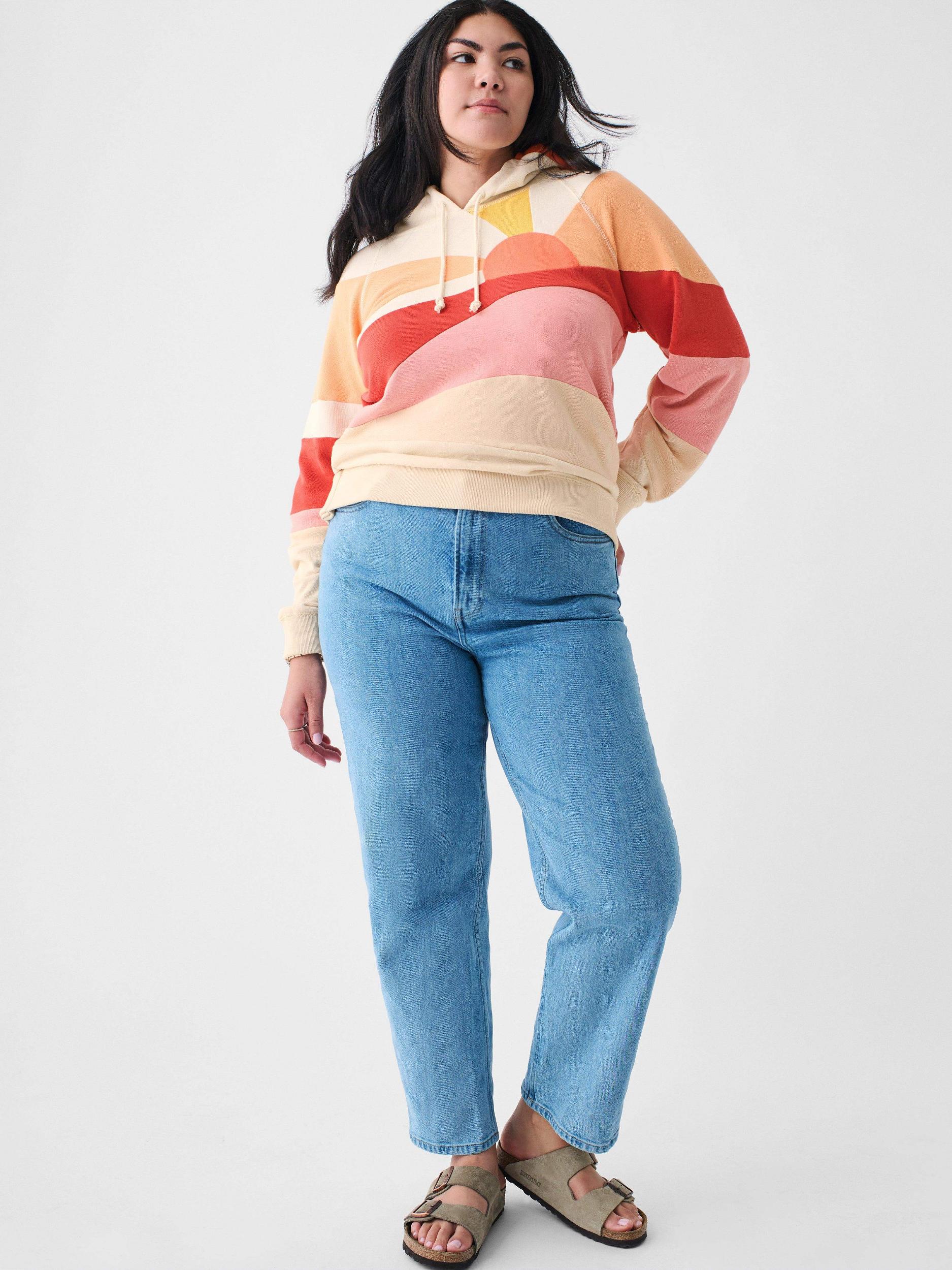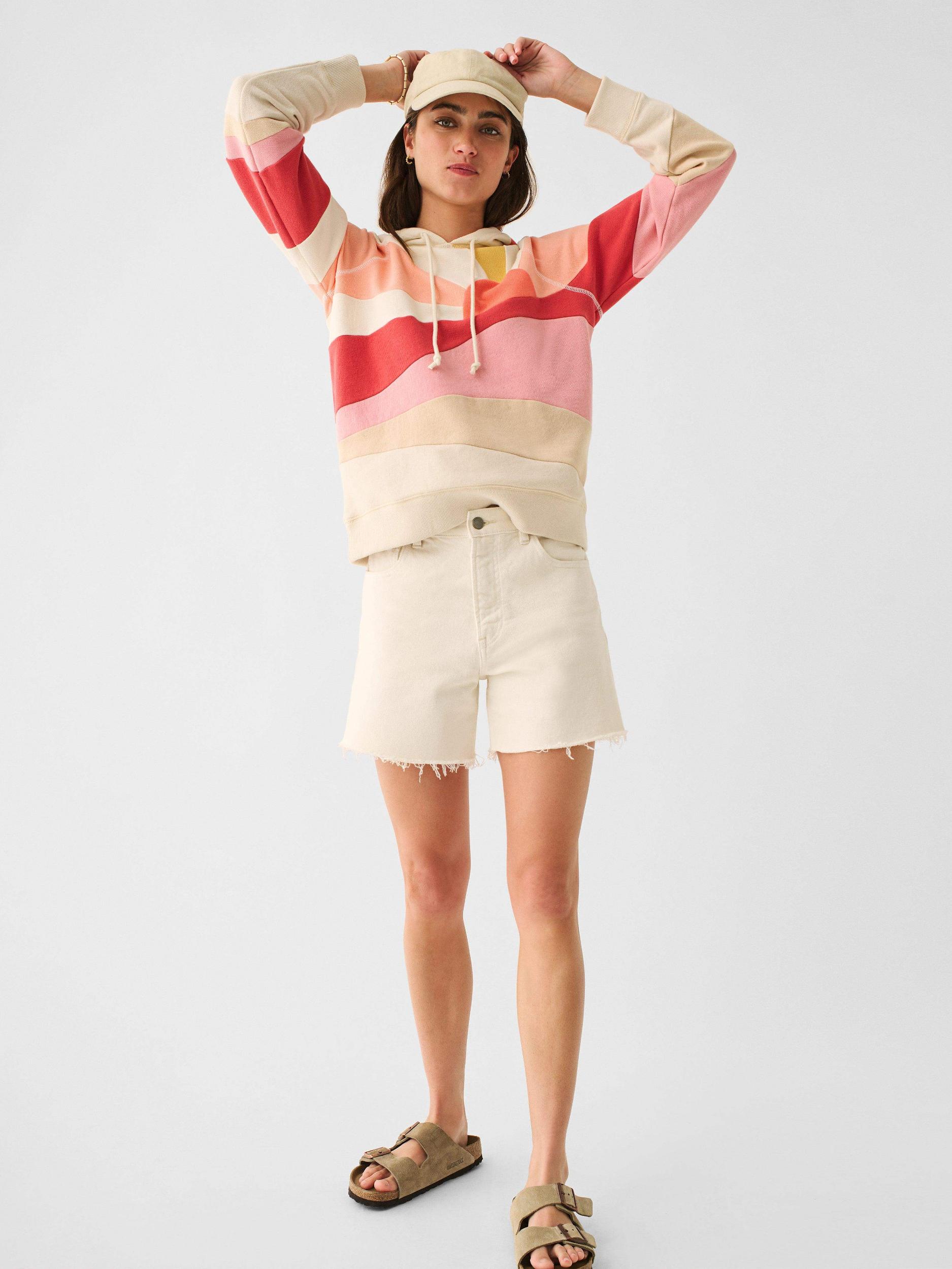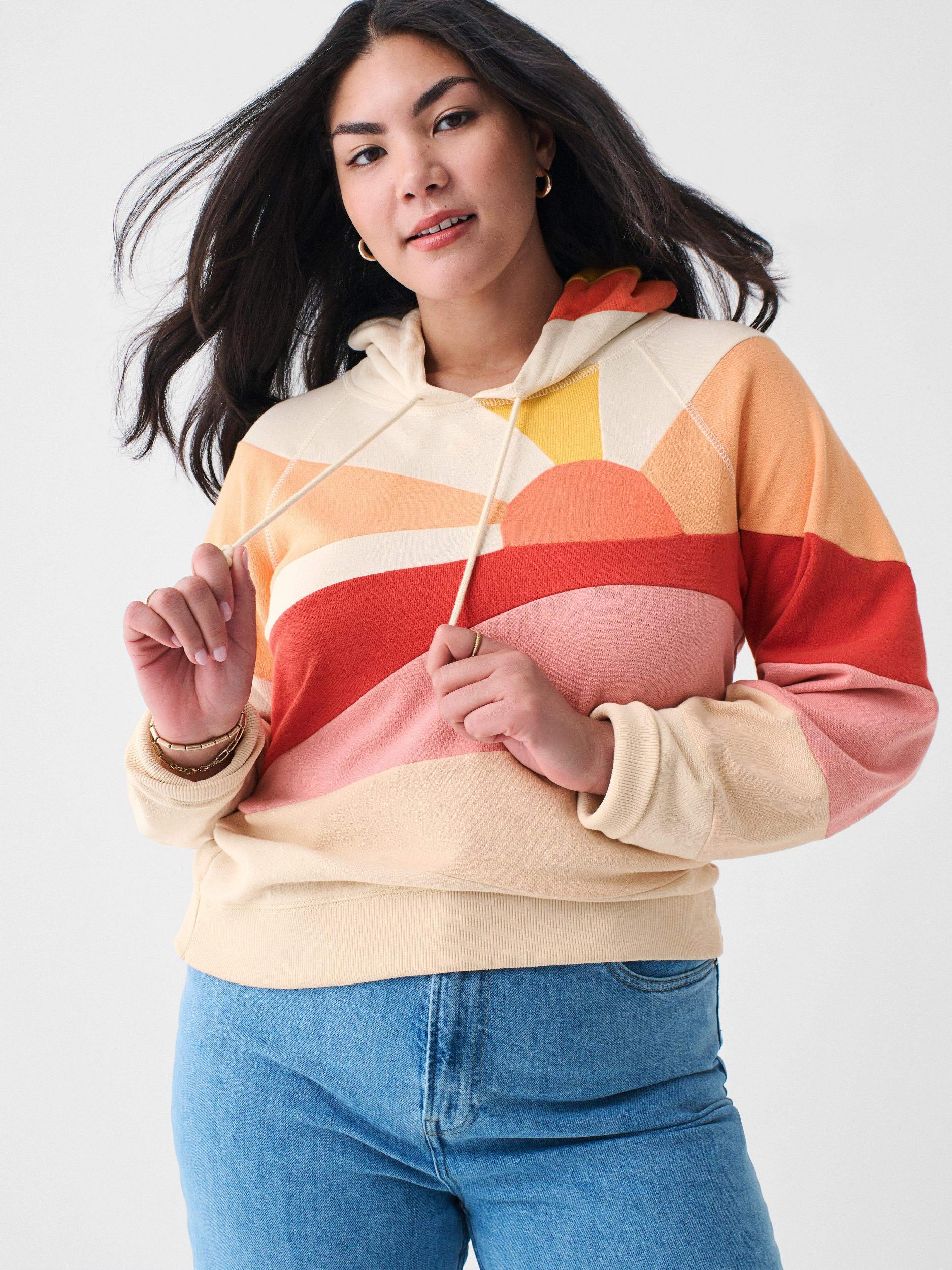 Sunny days are ahead in our ultimate Faherty hoodie. Made from a super-soft and lightweight French terry, this where everywhere layer is pieced together in a sun, sea, and sand motif that channels all the feel-good vibes. Fit: Relaxed fit Detail: Long sleeve hoodie with a fun in the sun inspired Pieced Design Material: 100% Pima Cotton Model: Lexi is 5’7 wearing size Small, Bri is 5'9 wearing size XL Care: Turn inside out. Machine Wash cold with like colors. Gentle cycle. Do not bleach. Tumble dry low. Remove promptly. Cool iron when needed. WKC0010-CYD