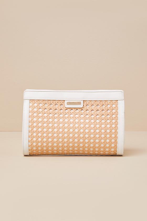 The perfect sunny day companion, this summery clutch by Shiraleah features a chic silhouette that pairs perfectly with winery tours, weddings, and everything in between. Smooth vegan leather and woven panels at the front and back shape the flat bottom design. Magnetic closures secure the roomy interior, complete with a zippered sidewall pocket and plenty of space for your go-to items.