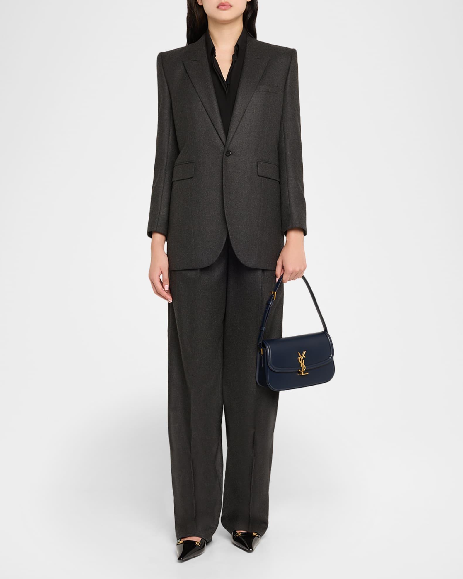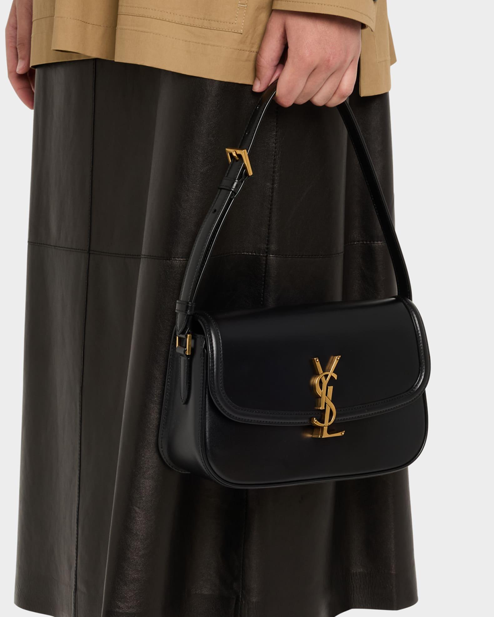 Saint Laurent "Solferino" shoulder bag in smooth calfskin leather Features signature YSL logo lettering Adjustable shoulder strap; 7.5" drop Flap top with magnetic closure Gold hardware Interior, one card slot Suede lining Approx. 9.8"W x 5.9"H x 2.4–3.1"D Made in Italy