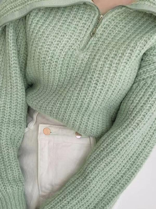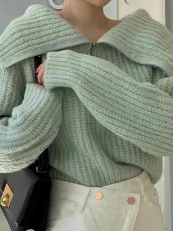 Solid Big Lapel Neck Half Zip Sweater