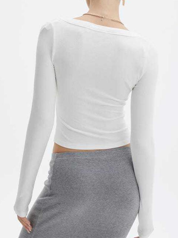 Solid Notched Neck Ribbed Cropped Long Sleeve Knit