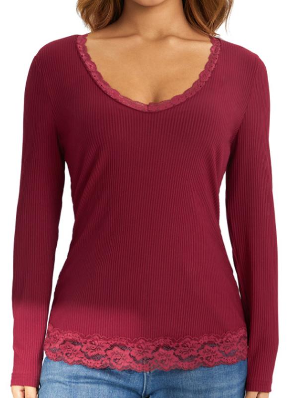 Solid Color Rib Lace Trim Slim Long Sleeve Knit