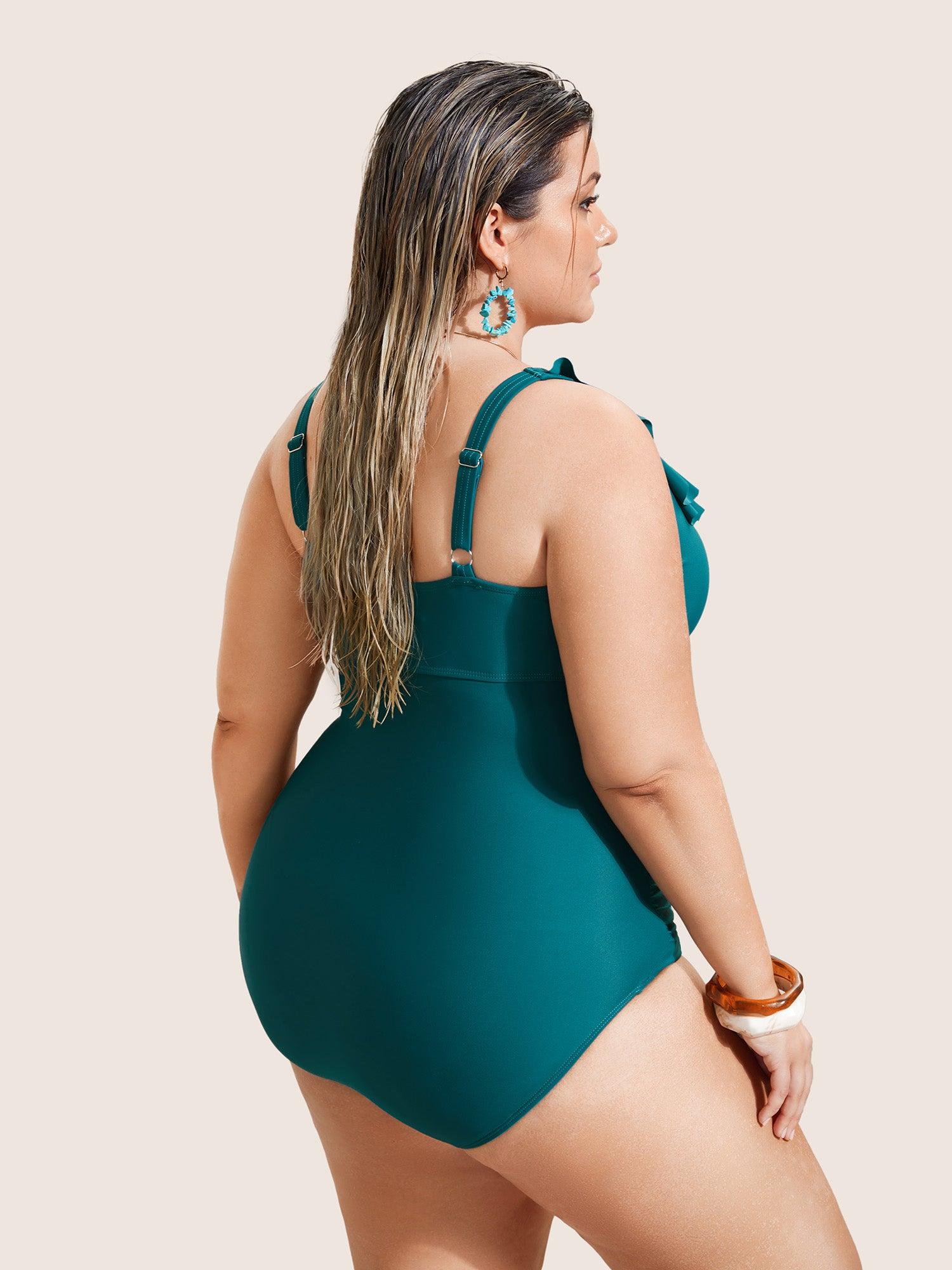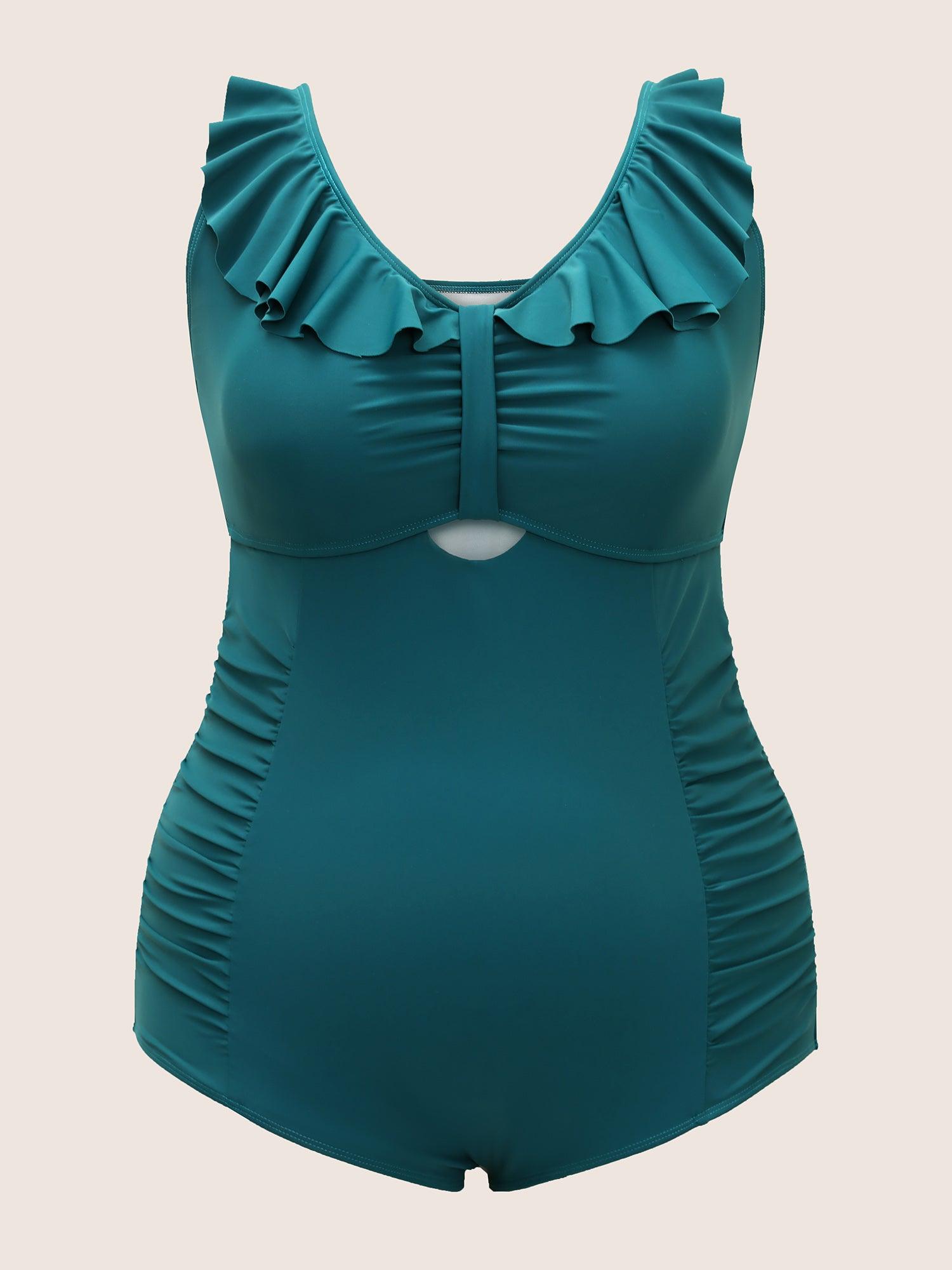 Shop Solid Cut Out Ruffle Trim One Piece Swimsuit now and redefine your style with confidence at BloomChic. Tailored for mid and plus-size women. This trendy Swimwear Women, sizes 10-30. Season:Summer;Color:Cyan;Style:Beach;Cup Type:Removable cups;Neckline:Heart neckline;Sleeve Type:Sleeveless;Prints:Non;Details:Ruffles, Cut-Out, Gathered;Pocket:No-pocket;Belt:No-belt;Chest pad:Removable Padding;Lining:Lining;Closure Type:Non