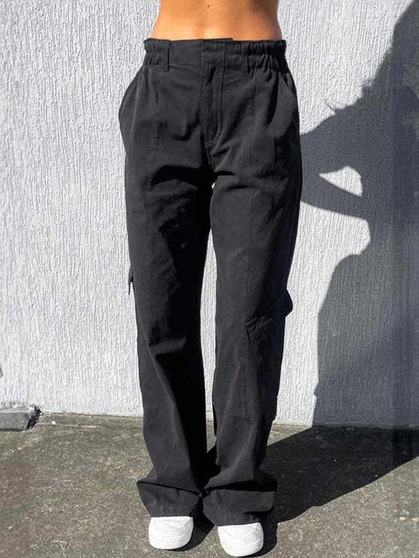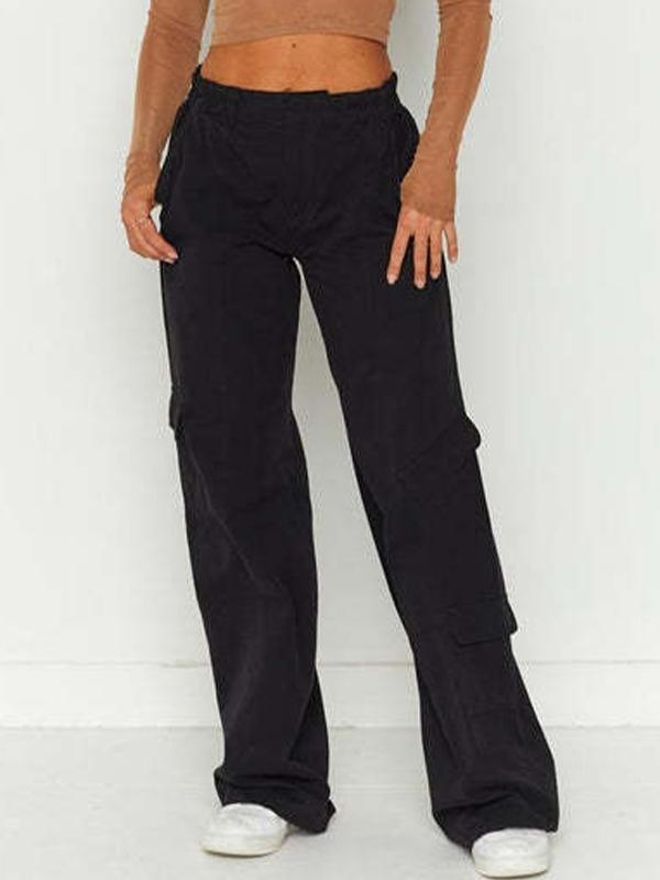 Solid Elastic Waist Multi Pocket Straight Leg Pants