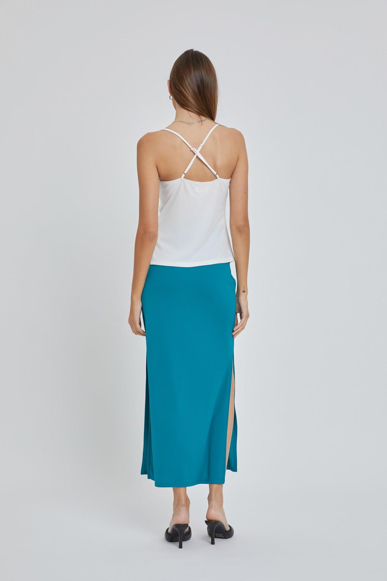 A solid maxi skirt made with a breezy fabric and side slit detail. Made with a stretchy waistband to be worn comfortably.