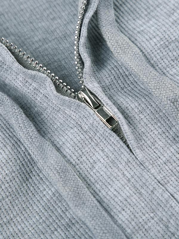 Solid Ribbed Zip Up Drawstring Hooded Long Sleeve Knit
