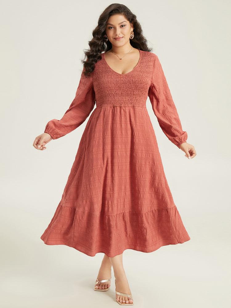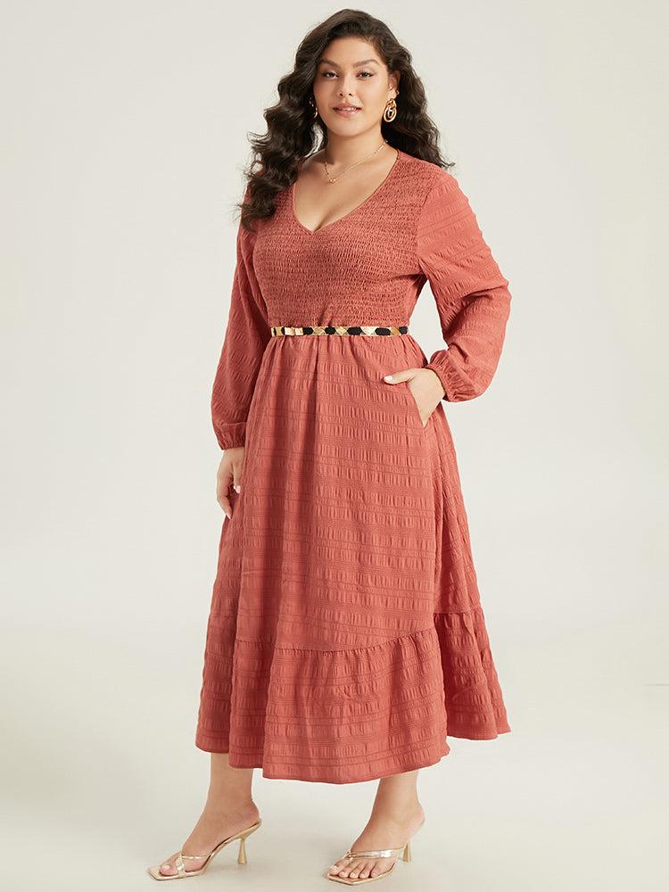 Shop Solid Shirred Plisse Flutter Hem Dress now and redefine your style with confidence at BloomChic. Tailored for mid and plus-size women. This trendy Dress, sizes 10-30. You can never go wrong with BloomChic Dresses. Color:DarkBlue;Style:Elegant;Neckline:V-neck;Sleeve Type:Lantern Sleeve;Pattern Type:Plain;Details:Shirred, Pocket, Elastic Waist, Patchwork, Plain, Elastic cuffs;Pocket:It is perfectly sized to carry a phone.;Belt:No-belt