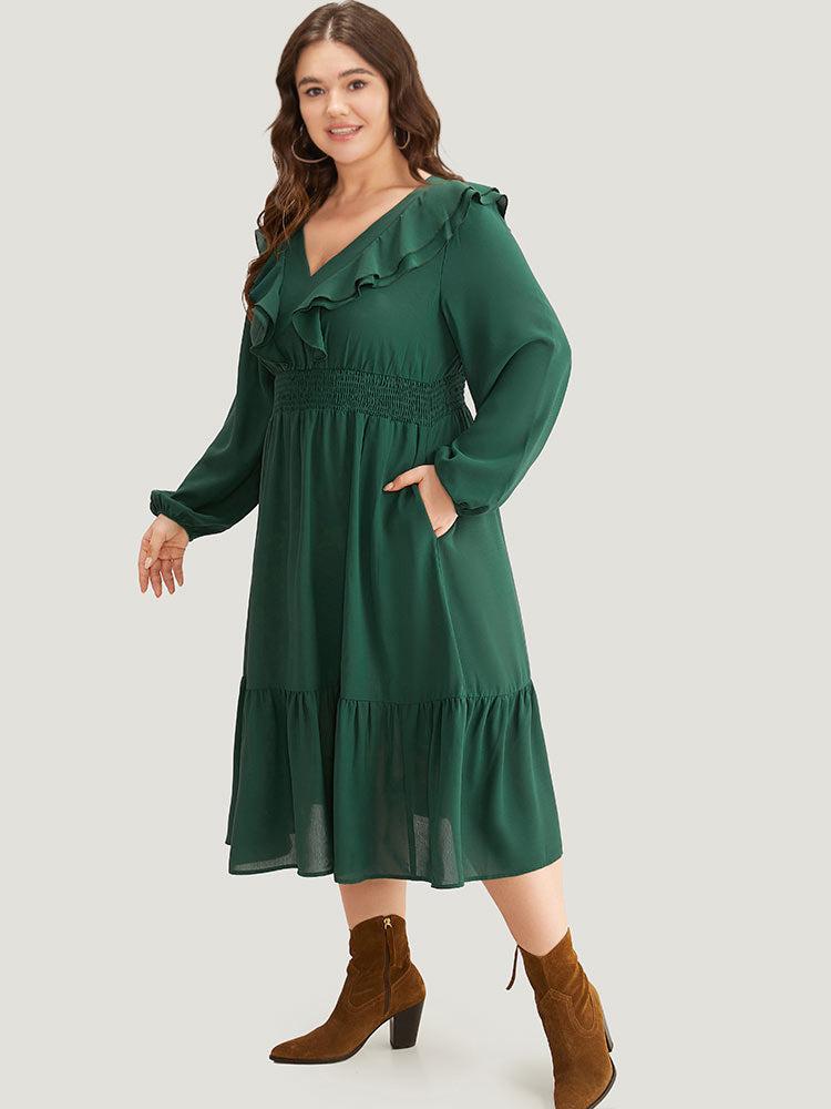 Shop Solid Shirred Ruffle Trim Pleated Dress now and redefine your style with confidence at BloomChic. Tailored for mid and plus-size women. This trendy Dress, sizes 10-30. You can never go wrong with BloomChic Dresses. Season:Winter;Color:DarkGreen;Style:Vacation;Neckline:V-neck;Sleeve Type:Lantern Sleeve;Pattern Type:Plain;Details:Shirred, Ruffles, Pocket, Pleated, Plain, Gathered, Elastic cuffs;Pocket:It is perfectly sized to carry a phone.;Belt:No-belt
