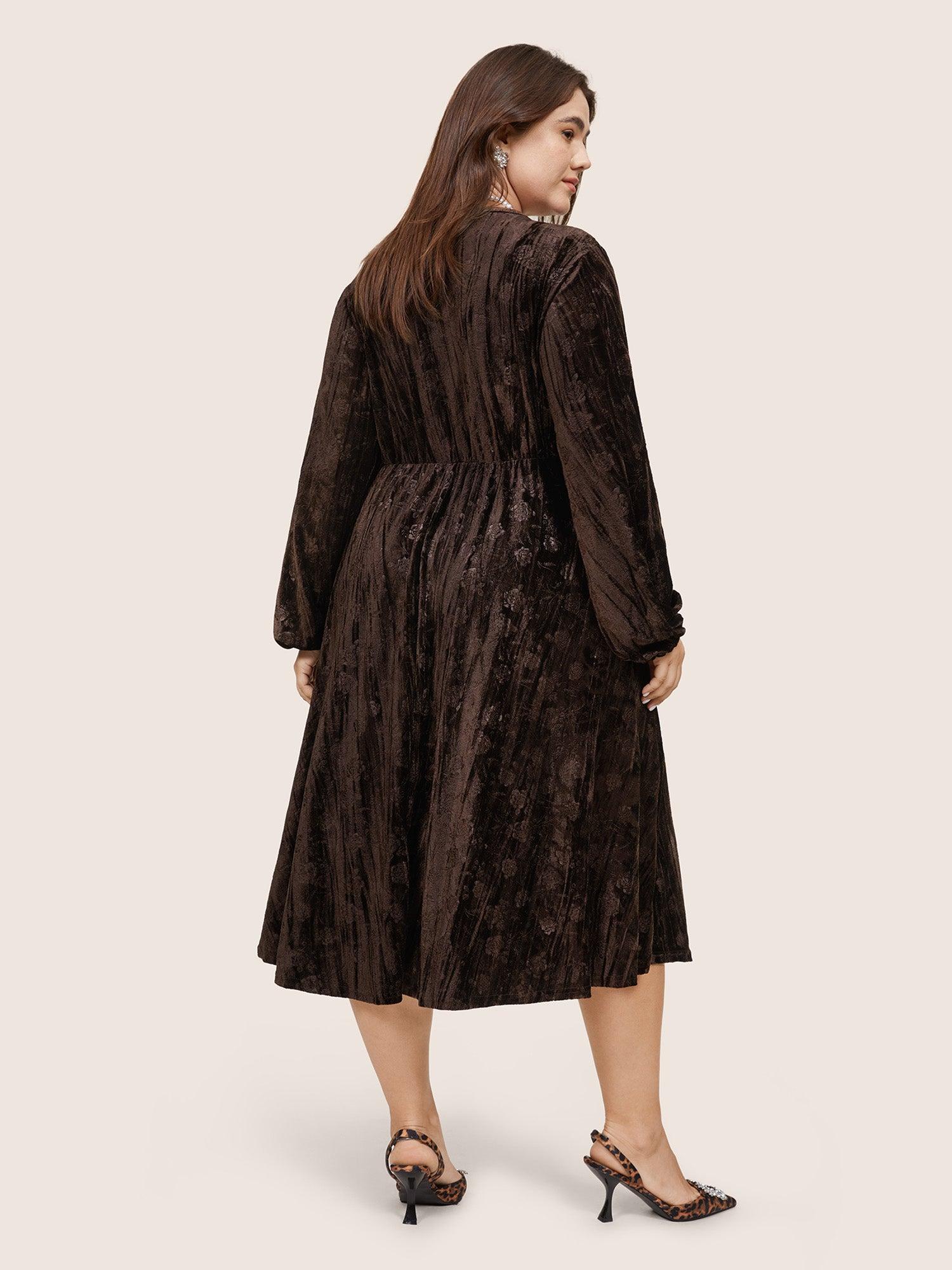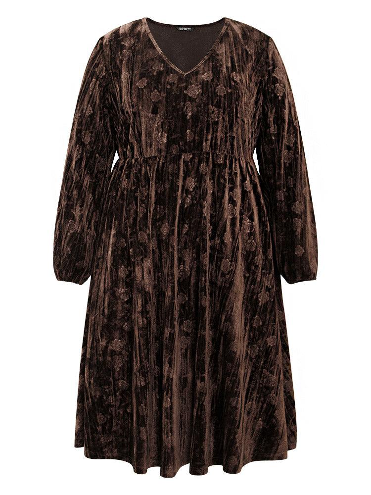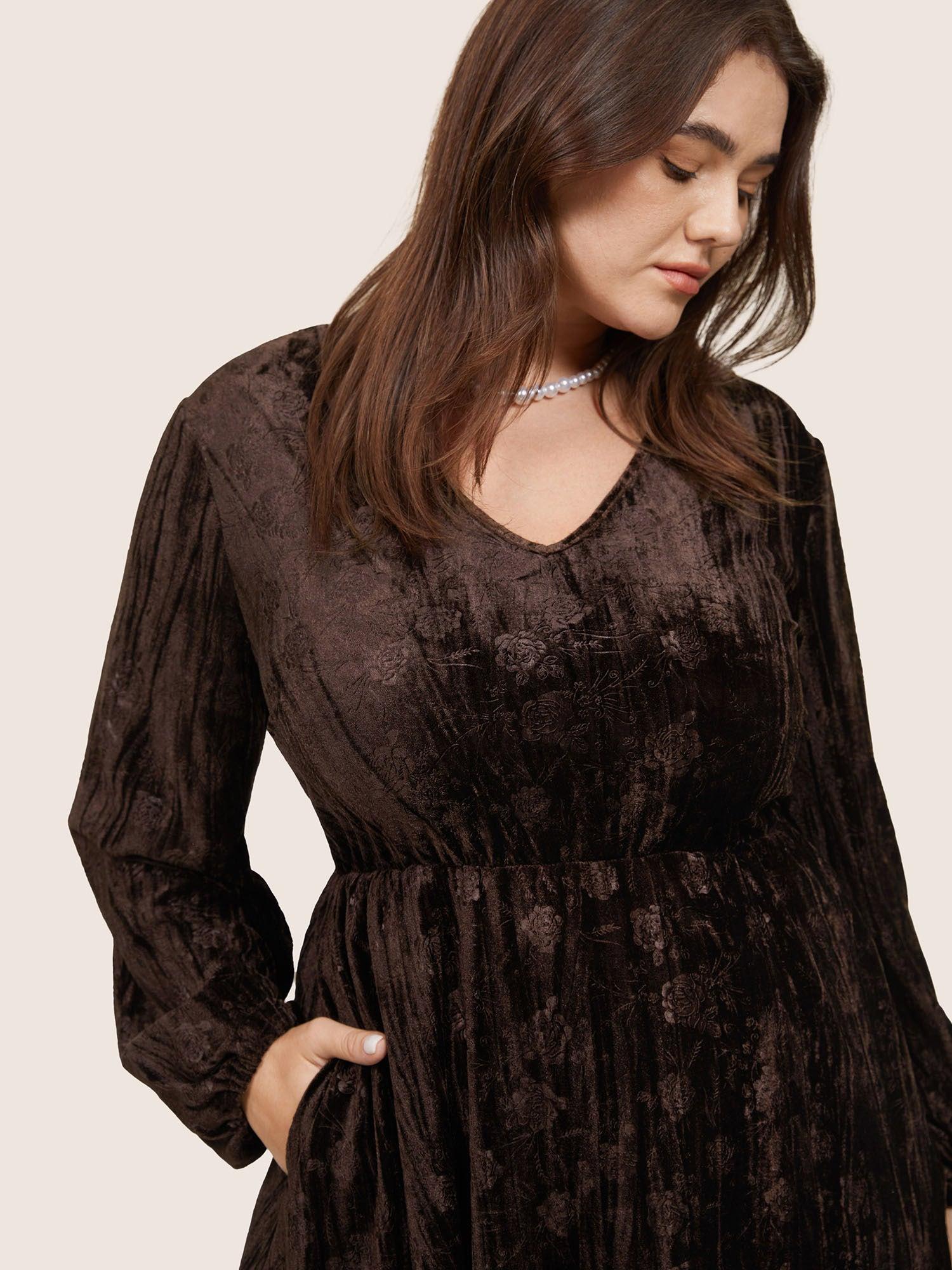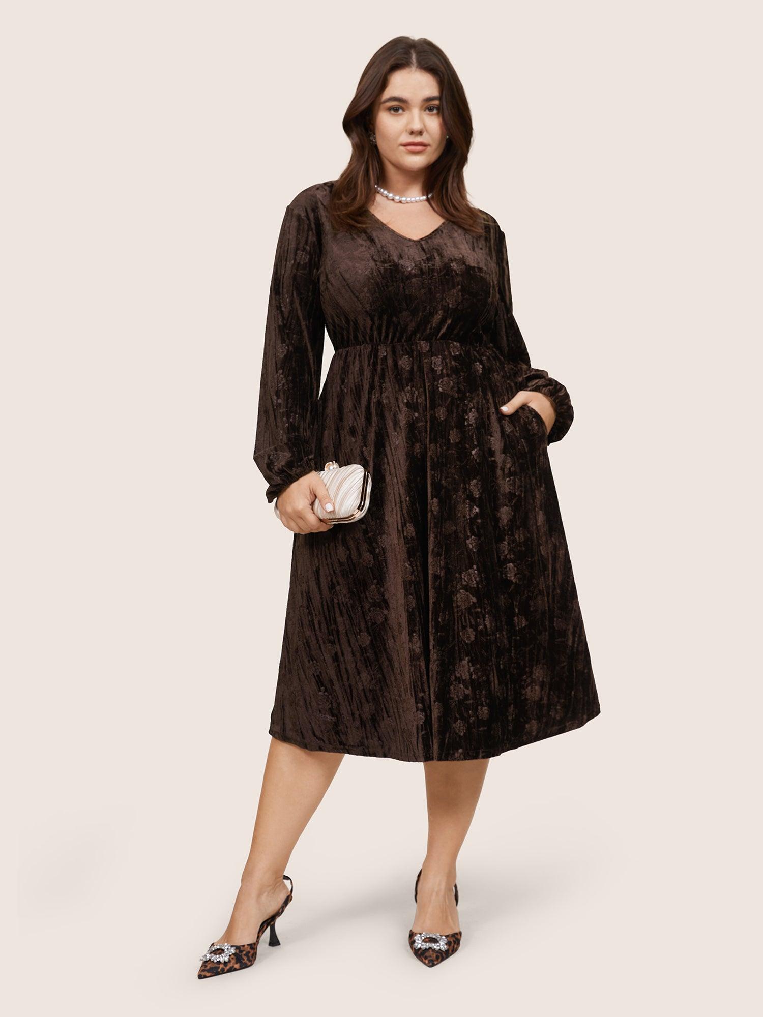 Shop Solid Texture Velvet V Neck Lantern Sleeve Dress now and redefine your style with confidence at BloomChic. Tailored for mid and plus-size women. This trendy Dress, sizes 10-30. You can never go wrong with BloomChic Dresses. Season:Winter;Color:DarkBrown;Style:Glamour;Neckline:V-neck;Sleeve Type:Lantern Sleeve;Pattern Type:Plain;Details:Pocket, Elastic Waist, Plain, Elastic cuffs, Velvet, Texture;Pocket:It is perfectly sized to carry a phone.;Belt:No-belt