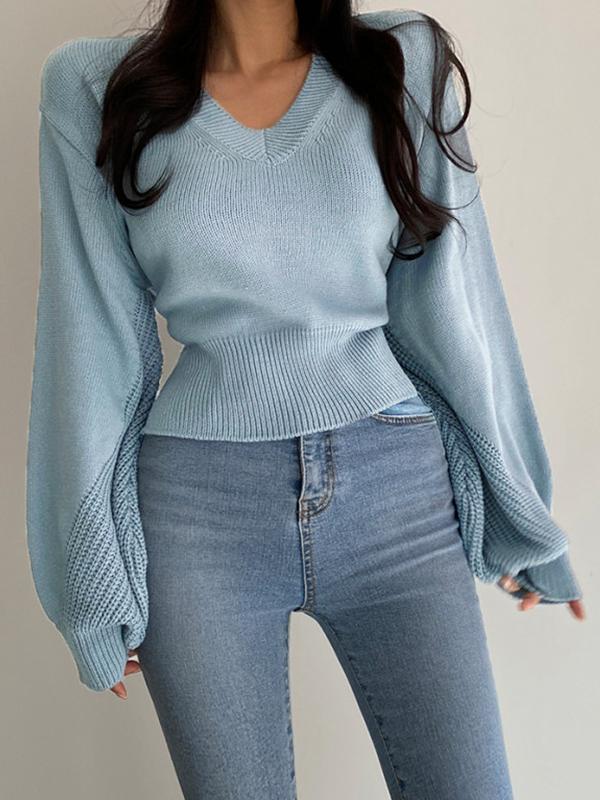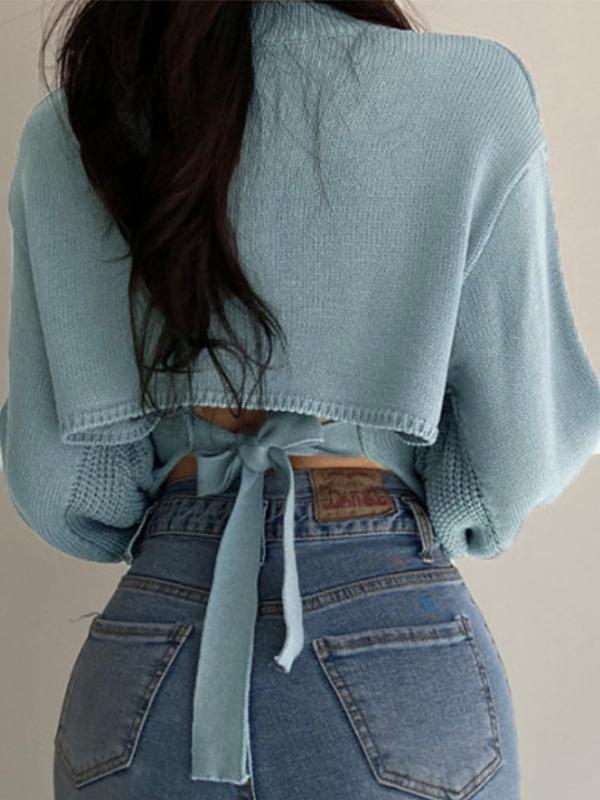 Solid V Neck Tie Back Lantern Sleeve Sweater