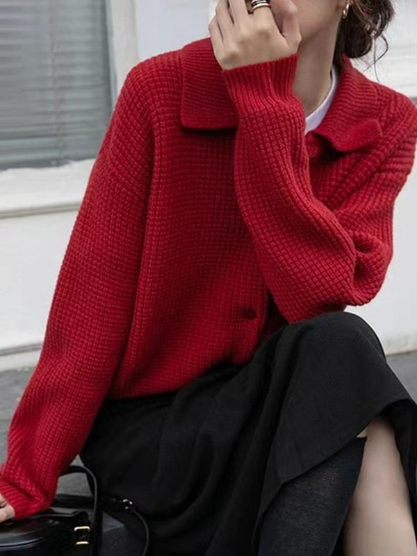 Solid Waffle Lapel Neck Cardigan