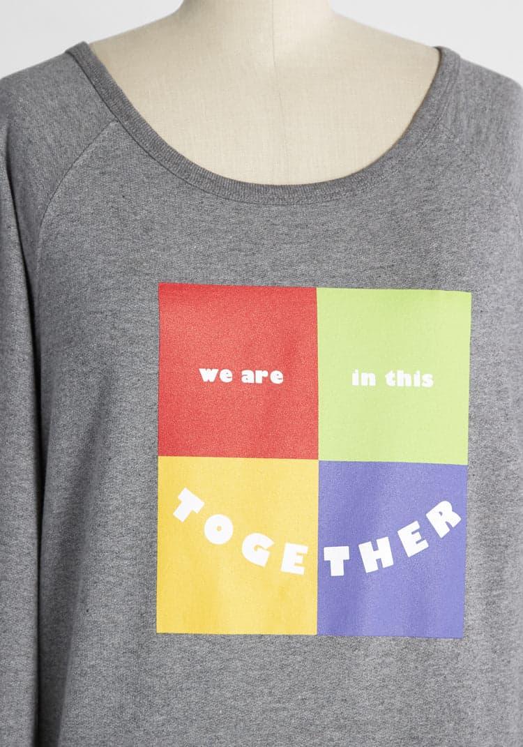 Let this grey graphic pullover sweatshirt unite you in style. Featuring an illustration declaring “we are in this together” orbiting red, green, blue, and yellow squares, this soft cotton-blend pullover boasts a relaxed fit, long raglan sleeves, and a scoop neckline.75% Cotton, 25% Polyester. Machine wash. Imported Fabric provides stretch. S=24 inches Length 2X=27 inches Length