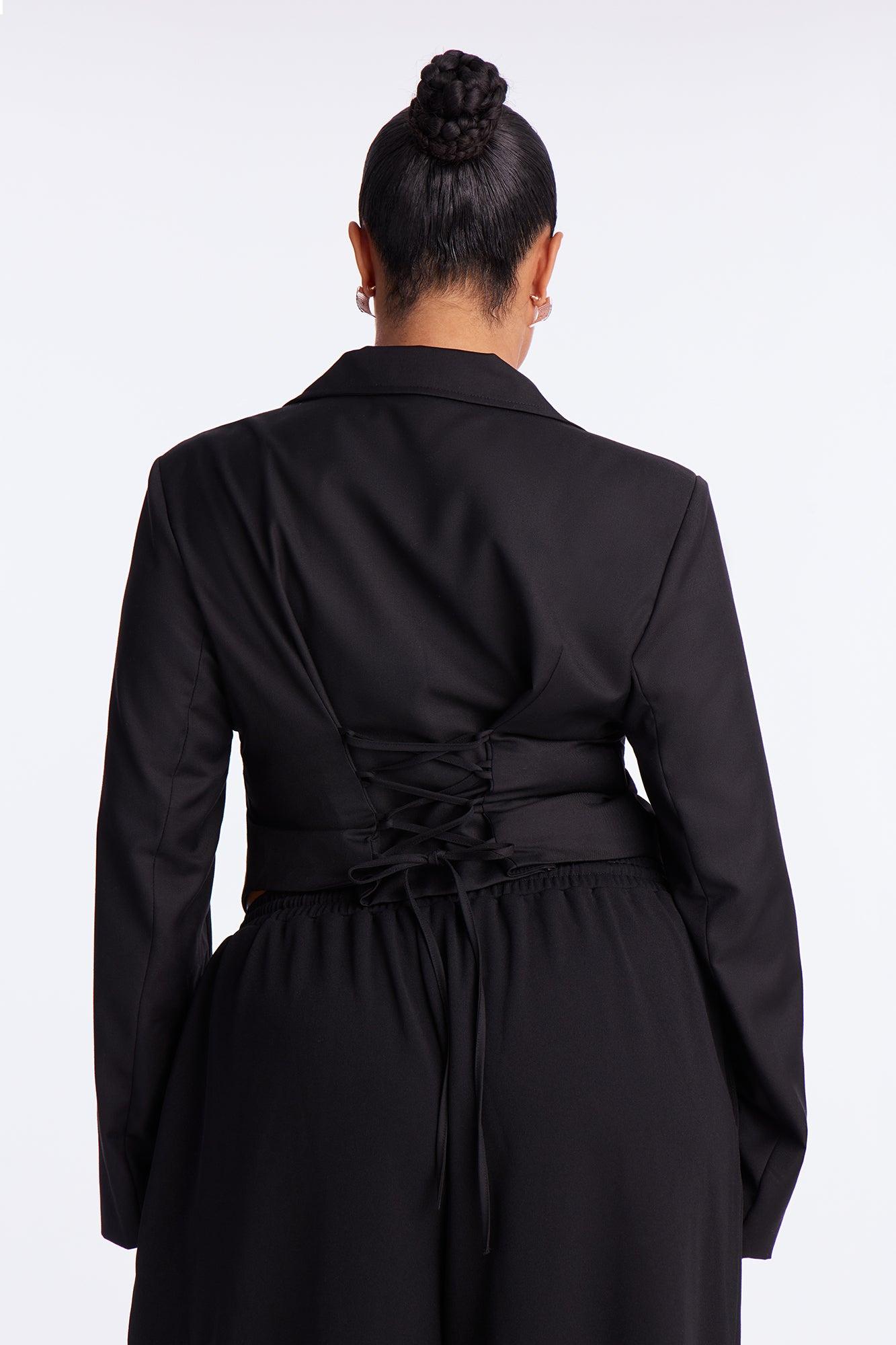 Available In Black And Mocha. Corset Collar Long Sleeve Crepe Woven Hook And Eye Detail Lace Up Detail Shoulder Pad Non Stretch Self: 80% Rayon 20% Polyester Lining: 100% Polyester Imported
