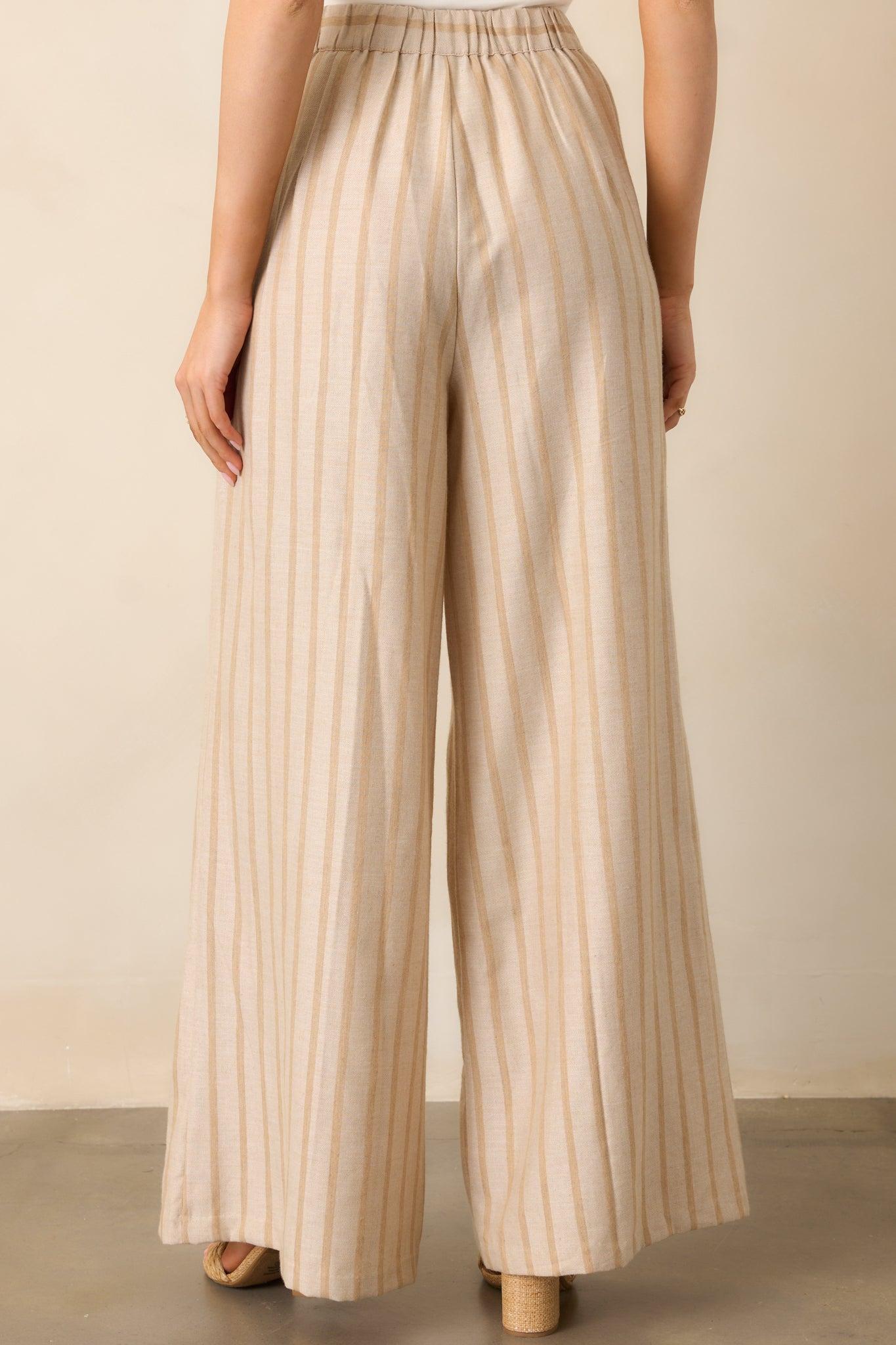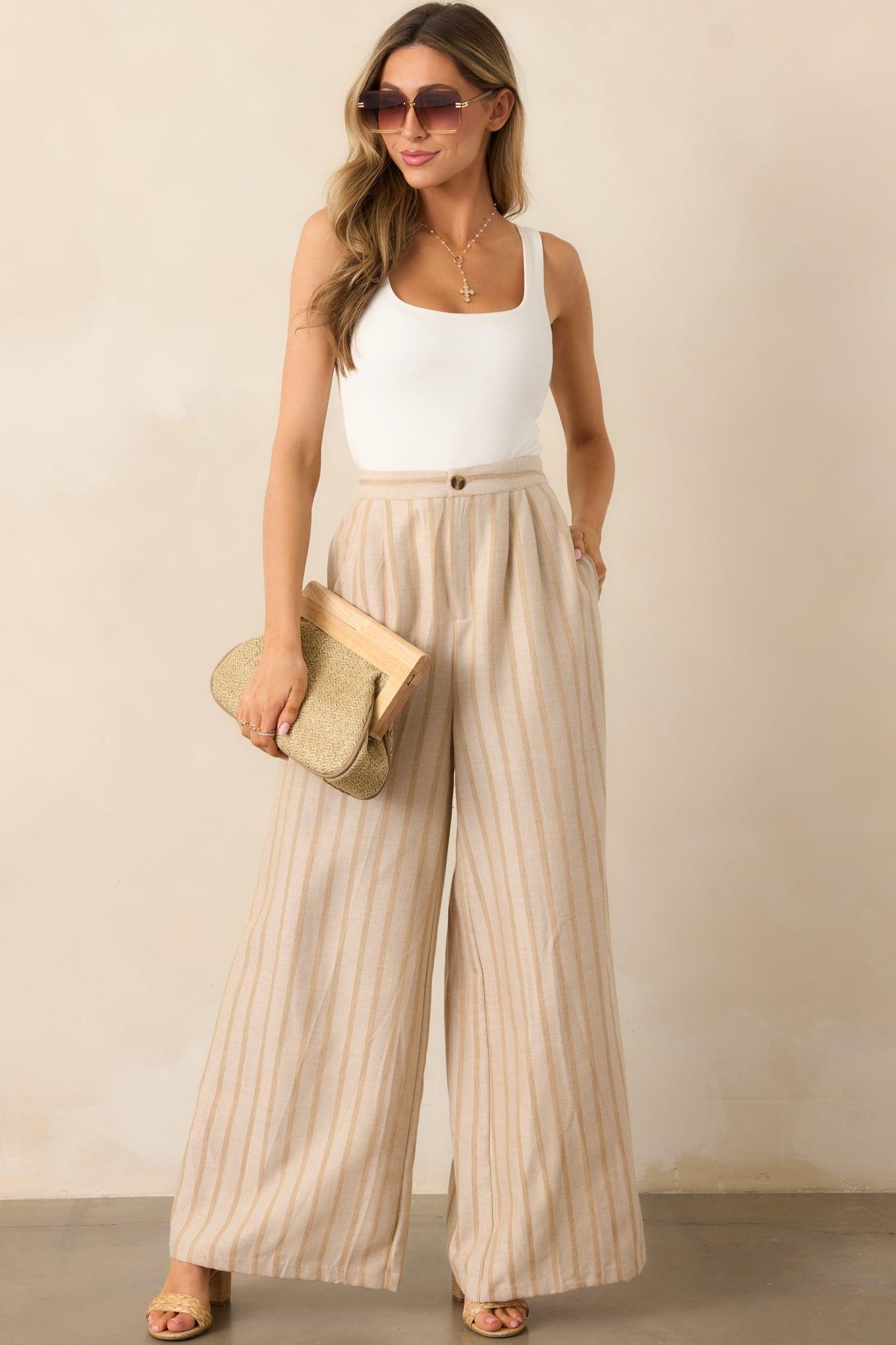 Elevate your casual style with the Something Simple Beige Stripe Wide Leg Pants. These chic bottoms are perfect for a breezy beach day or a relaxed brunch with friends. Their wide-leg silhouette and subtle stripe pattern offer a sophisticated yet comfortable look for any laid-back occasion. These beige pants feature a stripe print, a tailored wide leg design, a tortoise shell button closure, zipper closure, back elastic waist insert, and functional pockets.